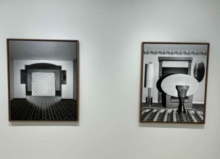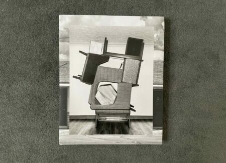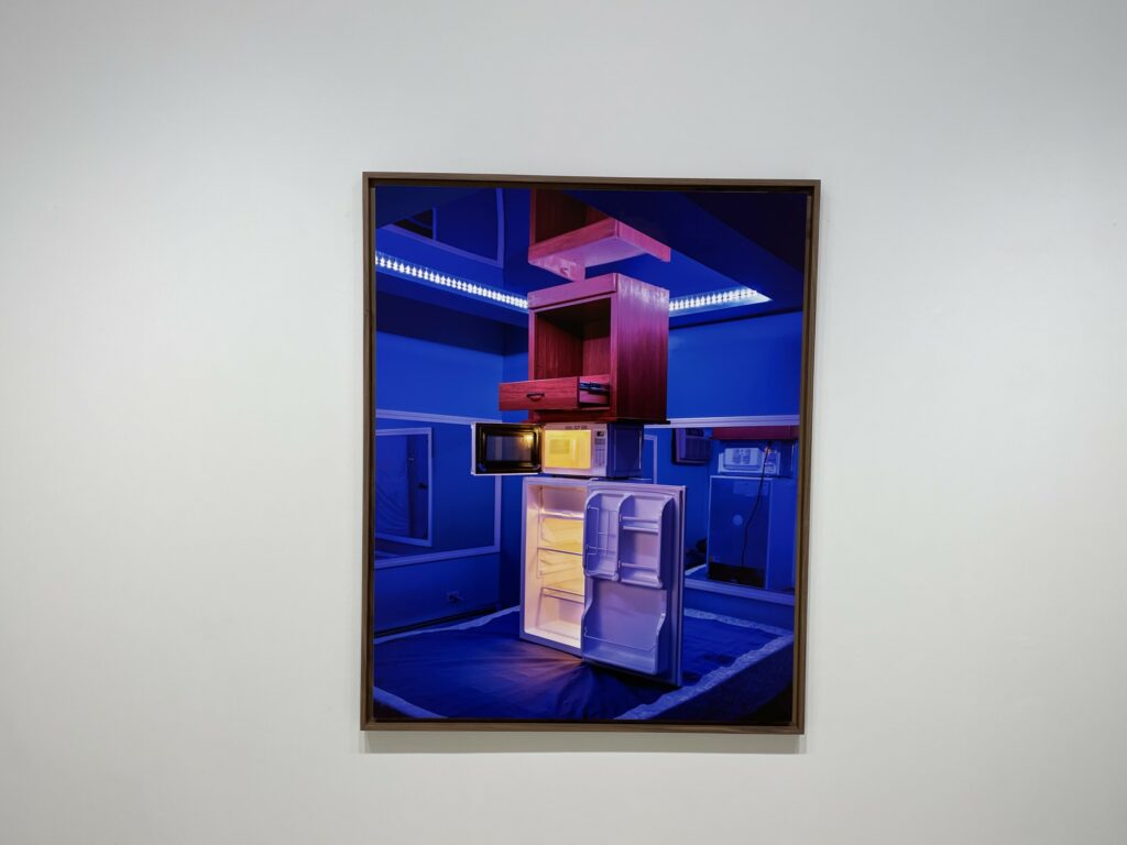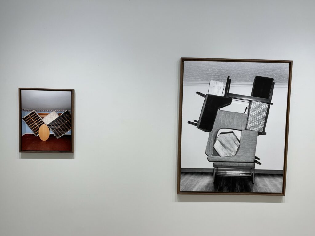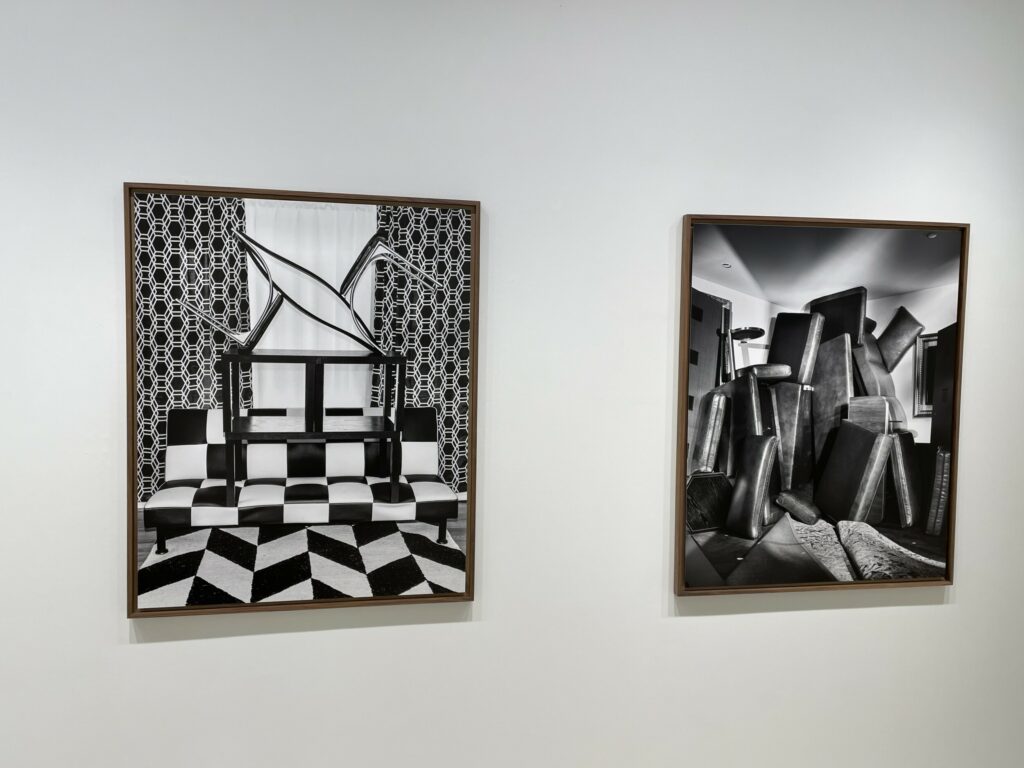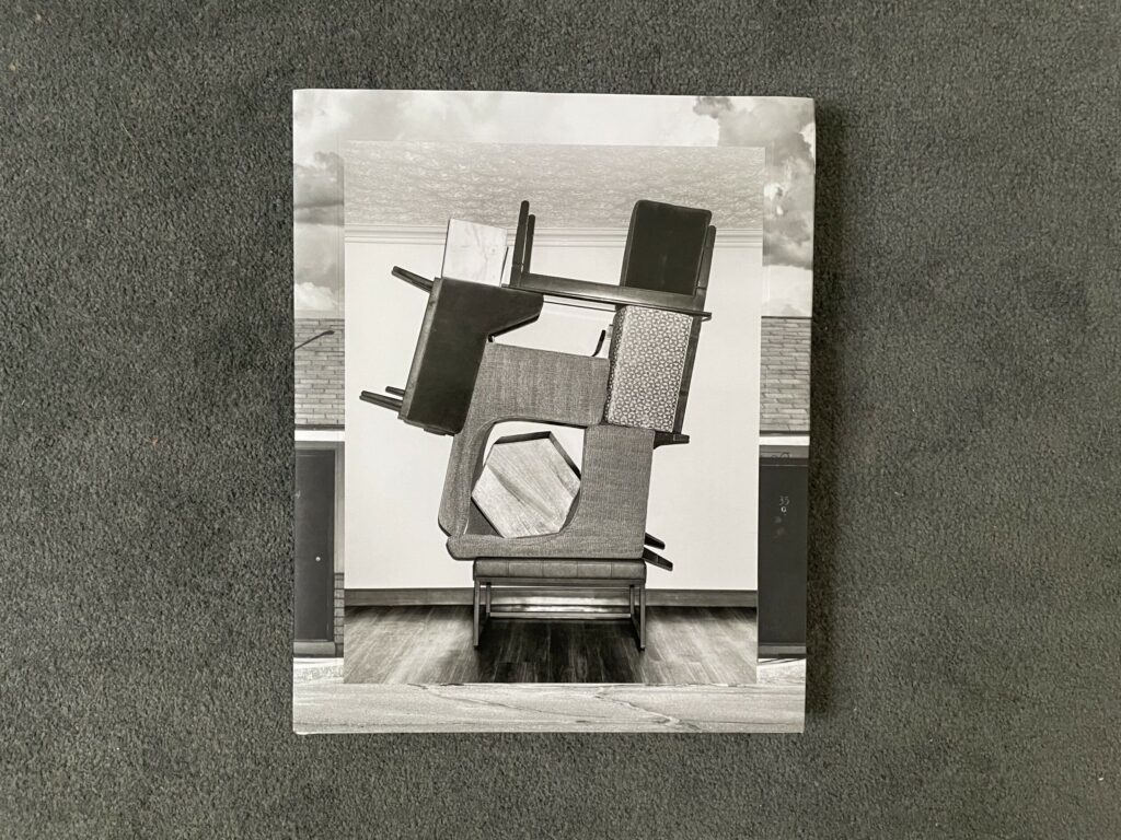 In between, Yudzon finds a tenuous balance between precision and precariousness, with furniture stacked into tight assemblages. When seen from one side, many of these constructions vaguely resemble Minimalist compositions, where camera-flattened geometries are organized into larger interlocked forms. A stinging blast of flash lights most of these setups, creating a secretive crime scene mood, particularly in black-and-white; in color, this brightness pulls out the textures of polyester upholstery, velour, and linoleum, giving the images a kind of seething vibrancy. In two other rooms, Yudzon got lucky – with one room decorated with bold black and white checkerboards and parallelograms, the contrasts of which he amplified further by stacking the furniture near the patterned curtains, and another featuring mirrors and blue mood lights, where he created a tower of mini-fridge, microwave, and bedside table, each with its doors yawned open, horror movie-style.