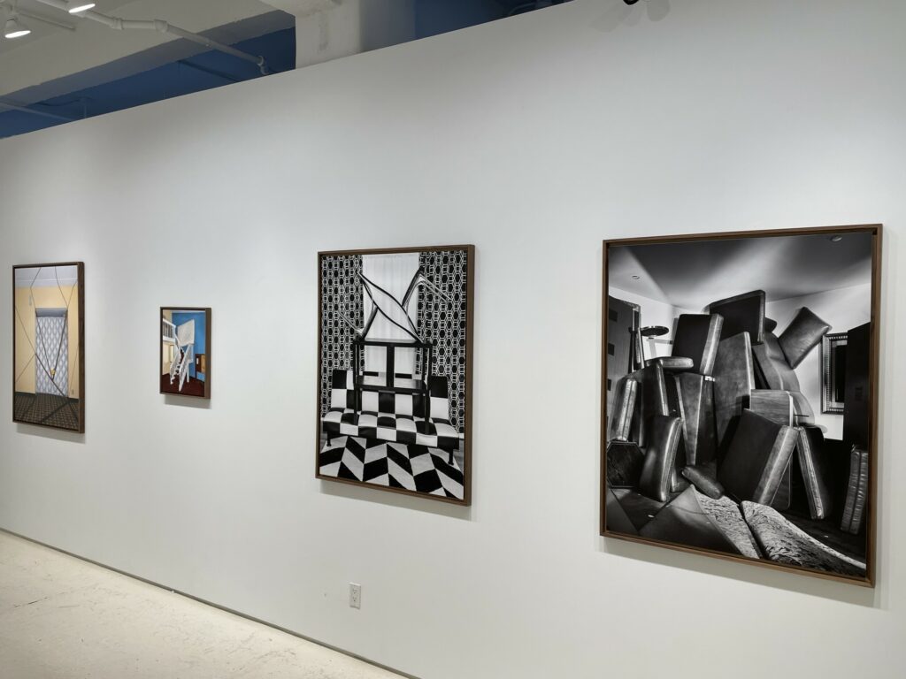 For roughly the past decade, Yudzon has been traveling around the United States, renting hotel rooms in some thirty-four states (and counting). At each hotel or motel, Yudzon rents what he hopes might be an interesting room (his inquiries about decor and amenities perhaps raising some questions about his intentions), and then settles in for the night. During his stay, he disassembles whatever furniture and other objects are provided in the room and then rearranges them into a temporary sculpture in that same space, which he then proceeds to photograph. Before he departs, he puts the room back in order, leaving little or no trace of his site-specific artistic efforts. In each case, Yudzon limits himself to the contents of the room, and constructs (and deconstructs) his installations by himself, without the help of anyone else.