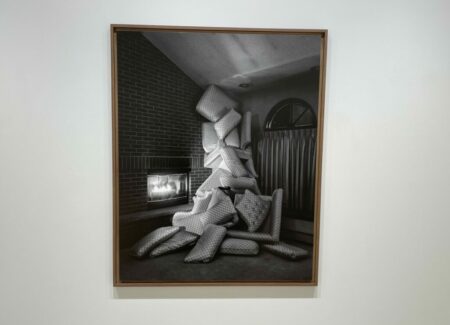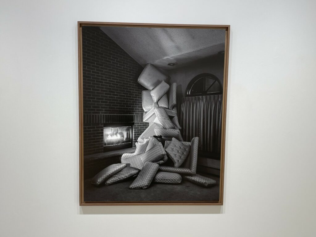 Working in both black-and-white and in color, Yudzon is to some extent at the mercy of the “laboratory of creativity” provided by his constrained surroundings. In a few cases, he has opted for a single bold intervention, staging an upended striped sofa in the middle of a bed, or placing a mattress atop a stairway railing or centered within the geometric niche of an archway. In others, he has gone for a more maximalist approach, creating tumbling piles of cluttered cushions and furniture that spill into the rooms like waterfalls and seemingly risk multiplying further and filling them to the ceiling.