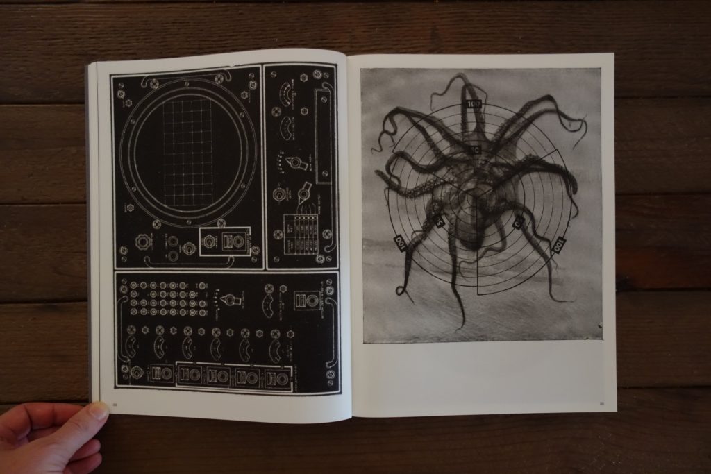 Suter interrupts this flow a bit with a second layer of inking, effectively doubling or montaging some of the images. This is especially effective when she adds a layer of mechanical line drawing or scientific diagramming to something wholly unrelated, often mixing manmade and natural into hybrids that share a common structure. This also makes the baseline stream of consciousness flow even denser, with images bleeding together, intermingling, and becoming obscured. The result is a sense that everything is connected, the logic of the combinations (a light bulb and a chemistry model, an octopus and a distance diagram, a floor mosaic and a horned insect) both incomprehensible and obvious. Unlike many photobooks, this is one that can be looked at again and again, with new discoveries to be made with each encounter.