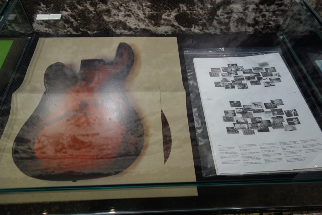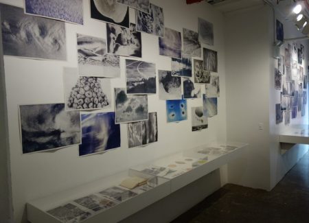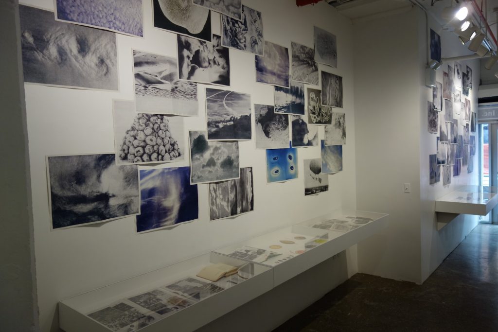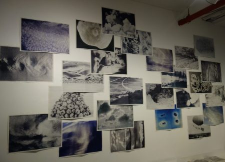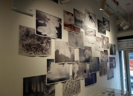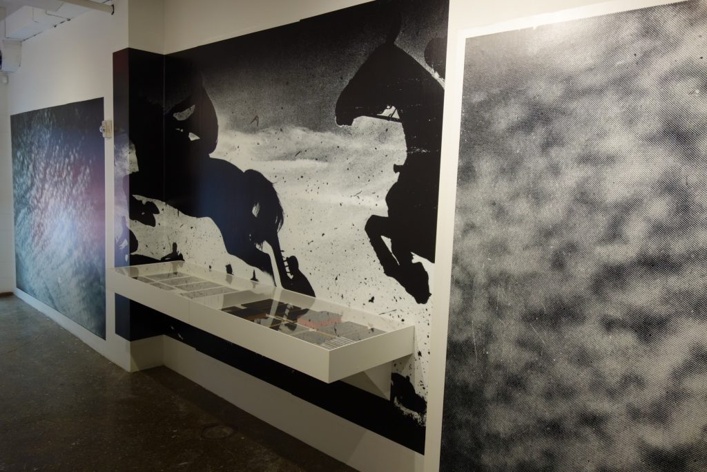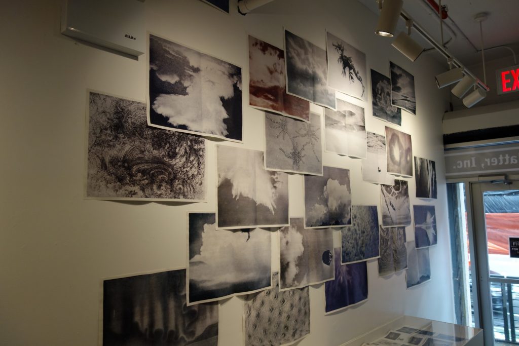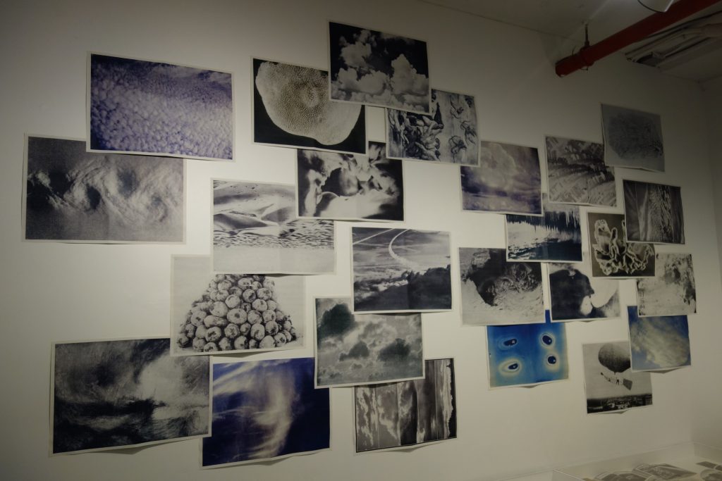 Installed as two large clusters of overlapped prints, the images quickly morph and expand, following one visual breadcrumb to the next. Various cloud types and skyward views extend first to their near relations: contrails cutting across emptiness, massive storms swirling across oceans, volcanic eruptions sending smoke into the sky, and man-made mushroom clouds billowing out with lethal force. Suter then makes connections to all kinds of flying things – fighter jets, blimps, balloons, and test machines, and then divers, jumping horses, birds, gods, and mythical beasts. She follows detours to things that look like clouds – sheep, coral, sand dunes, ocean waves, hanging moss, arctic snow fields, and microscopic views of who knows what – and then gets even more arcane, pulling us into machine diagrams, dot matrix computer printouts, and the swirled decoration on fancy guitars. The process itself is both intellectual and improvisational, the associations and resonances intuitive and clever.