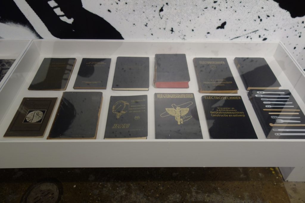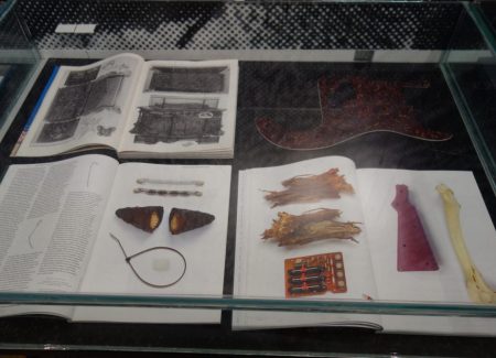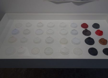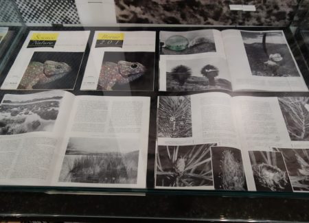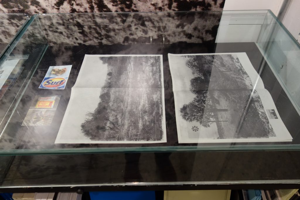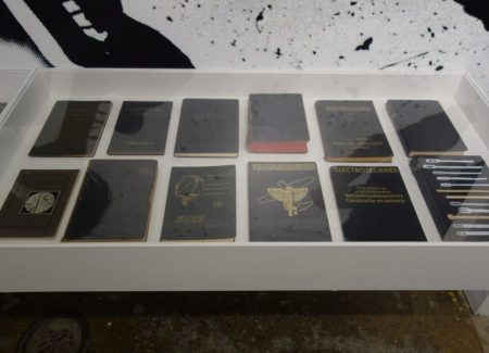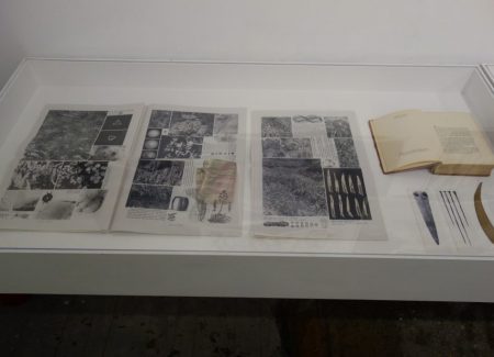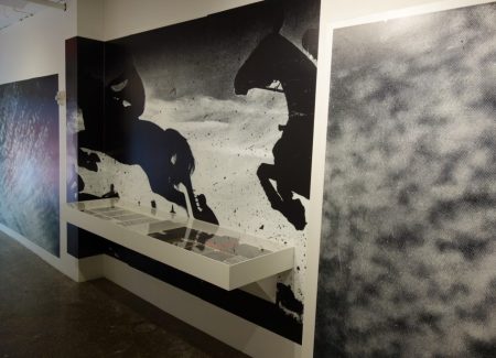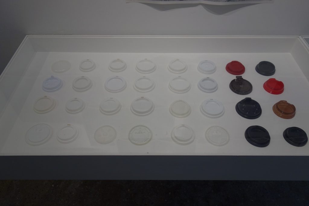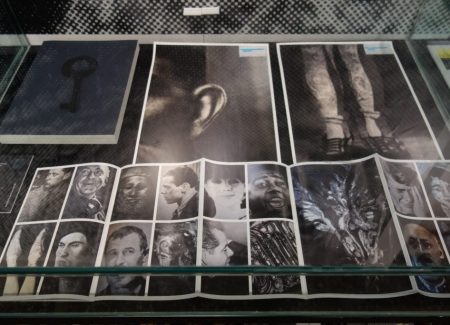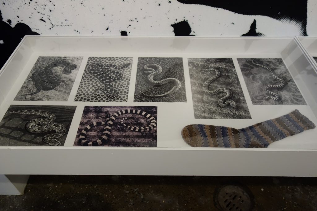 JTF (just the facts): An installation consisting of paper prints, vinyl images, and vitrines, set along the back wall of the bookstore and in the side room. The paper prints are installed in two dense groups of 25 images each, affixed directly to the walls and unframed, while 5 large vinyl images provide a backdrop to other areas of the show. 15 vitrines are filled with the artist’s various publications, with representative samples, spreads, and images, as well as clusters of plastic coffee lids, images of snakes with striped socks, electrical subject matter books with black covers, and other ephemera. (Installation shots below.)