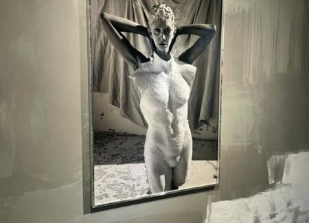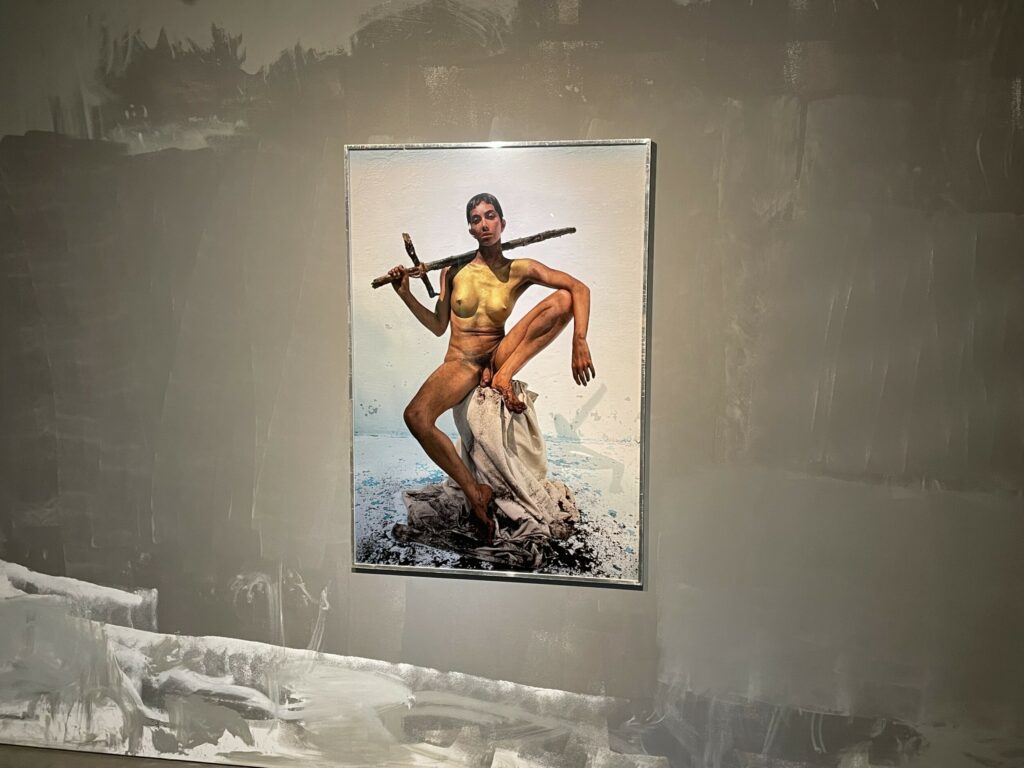 It seems altogether appropriate that a transwoman like Gutierrez would find affinity with figures who have have been composite male-female figures, either as hybrid gendered deities or as women who played the roles of men. Her image as Ardhanarishvara (the Hindu combination of Shiva and Parvati) uses simple black paint as the transforming element, her sinuous body covered and slicked, her hair in a loose twirl, and an array of extra arms taking shape as imprints on the white wall behind her. Her portrayal of Joan of Arc features roughly cut short hair, spray painted golden armor, and a sword made from sticks, her bluntly androgynous bravery presented unflinchingly. And her representation of the Chinese warrior Hua Mulan (who famously disguised herself as a man to fight in battle) uses a plaster cast to re-imagine her body, once again leading to an identity with combined male/female attributes.