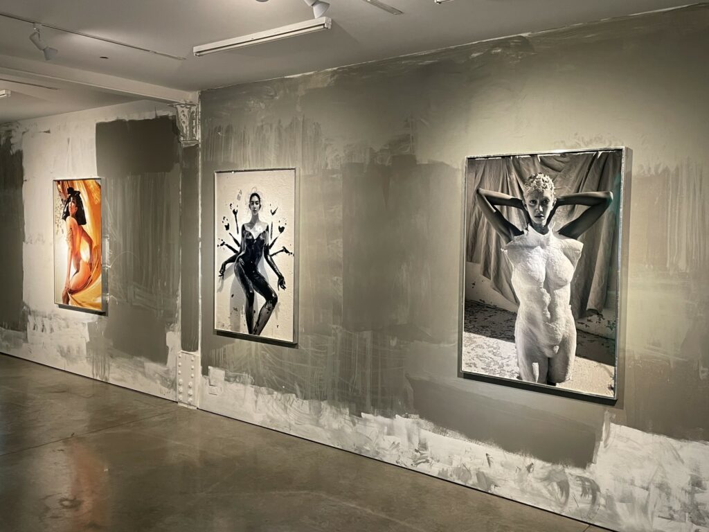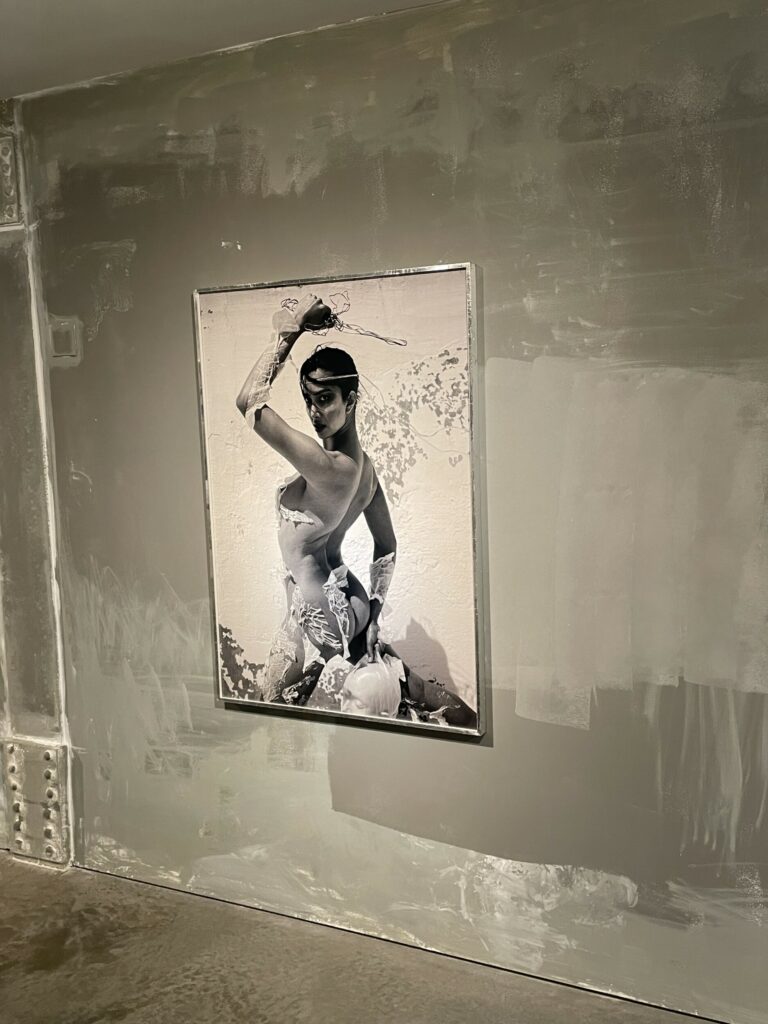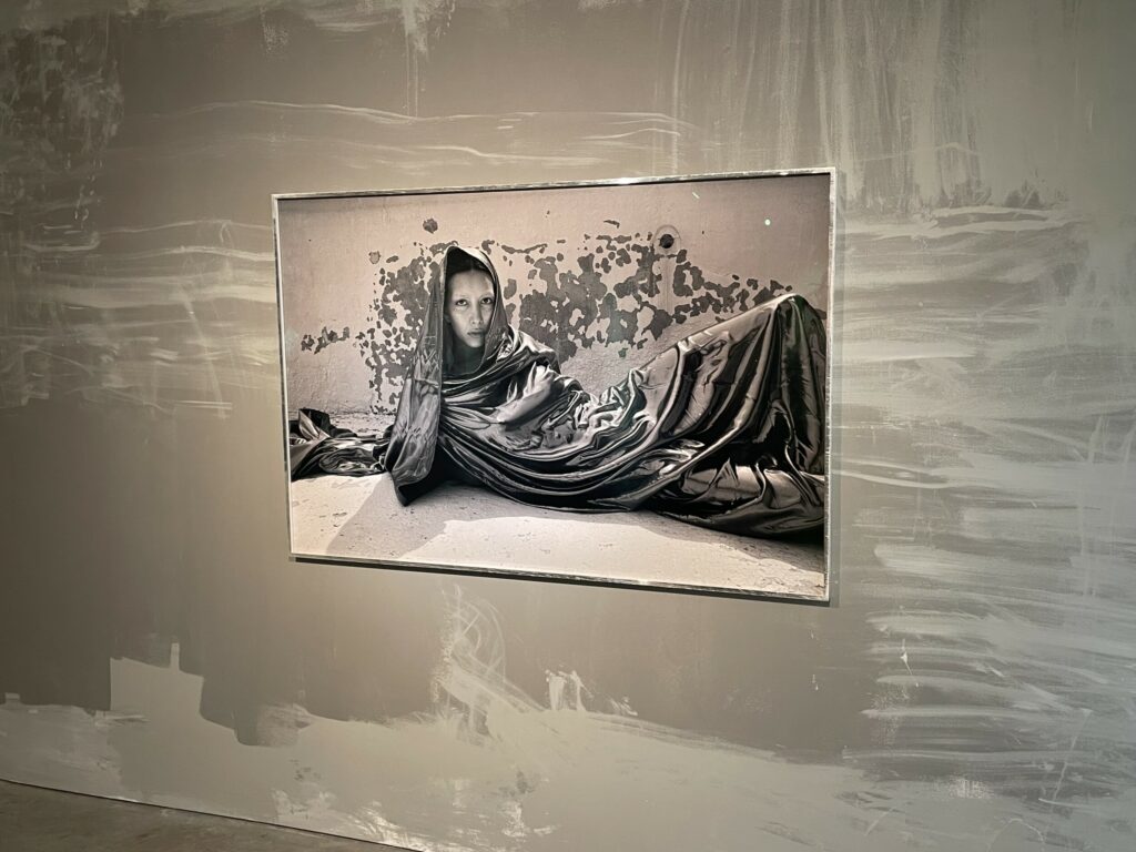 JTF (just the facts): A total of 8 large scale black-and-white and color photographs, framed in hand-distressed welded aluminum and unmatted, and hung against roughly painted grey walls (with linen curtains) in the back gallery space. All of the works are c-prints, made in 2021. Physical sizes are either roughly 55×38 inches or 43×65 inches, and all of the prints are available in editions of 7. (Installation shots below.)
