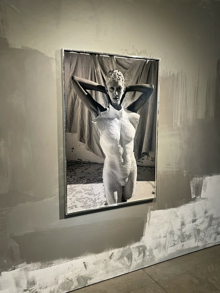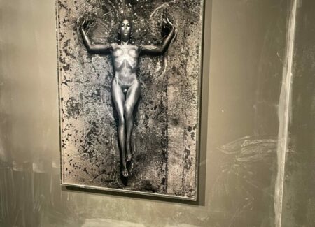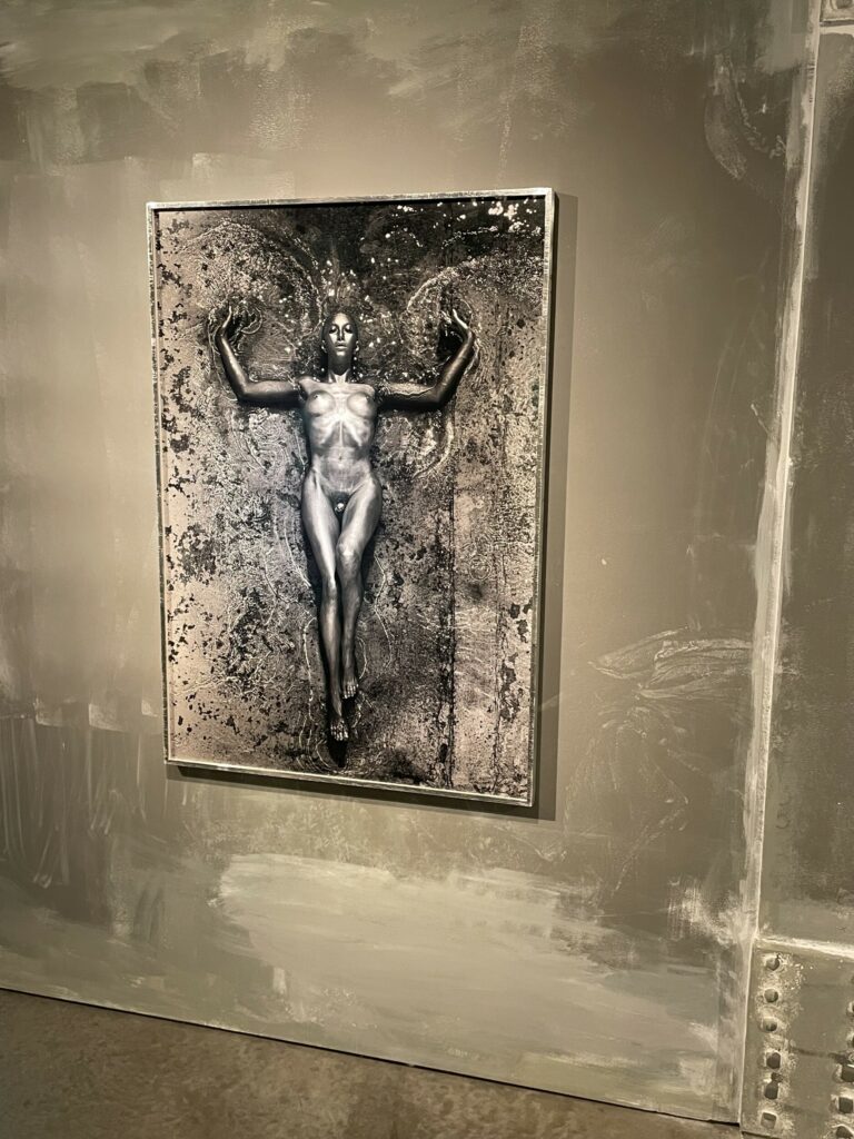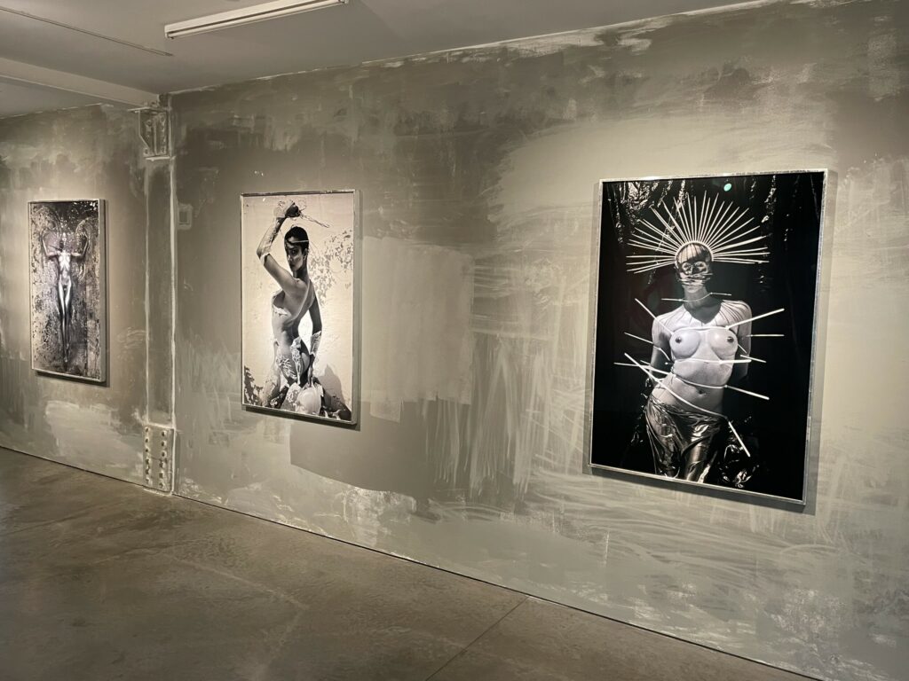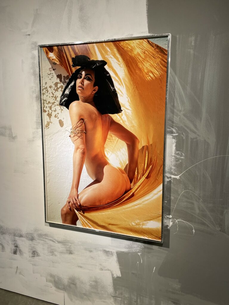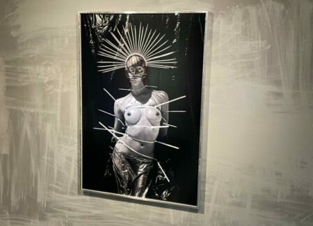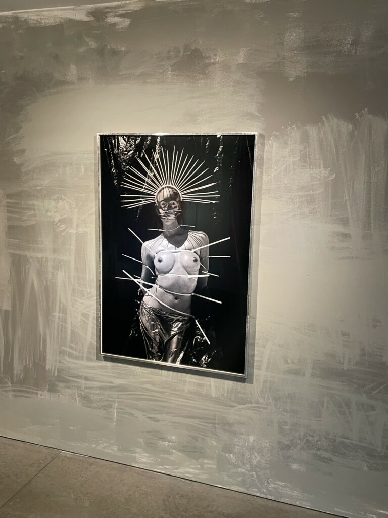 The rest of the works included in the show depict more spiritual subjects. Gutierrez as the Virgin Mary riffs on the traditional motif of the cloaked head, wrapping her body from head to toe in glossy black folds. The Syrian fertility goddess Atargatis is recreated with much less modesty, Gutierrez’ nude body covered in shimmery silver and posed as though protectively emerging from a watery void. And her version of Our Lady of Guadalupe features a spiky halo made from plastic zip ties, which bind her nude body while sparkling with lines of light against the darkness.