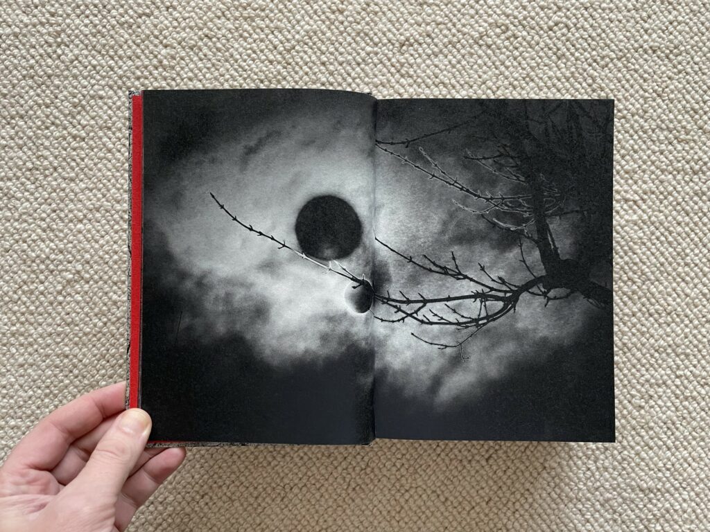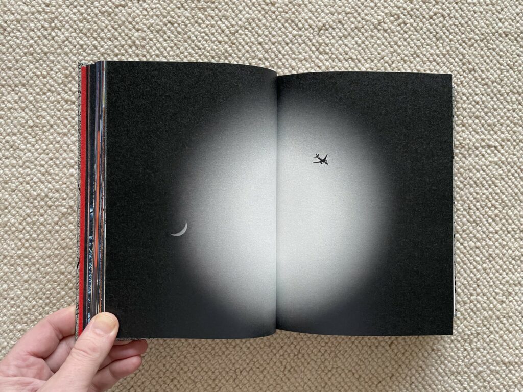 Those familiar with Kawada’s long history of image making will find plenty of motifs here that offer connections to and harmonies with the past. Mottled, stained, cracked, bubbled, scratched, reflected, and otherwise distorted surfaces make plenty of appearances, alluding to stories of damage and decay as well as a kind of pervasive disorientation, where we steady ourselves by looking closely at something that refuses to resolve and becomes almost alien. Kawada is also innately in tune with cycles of of nature, most notably the movements of the sun and moon, which take on ominous and apocalyptic overtones here when seen in their darkest zones. Cloud banks make a particular repeated appearance in Vortex, from bulbous masses to more sinister streaks and bleeds that swim across the hazy (or fiery) skies. These views are then quietly populated by lone airplanes and helicopters, and closer in by dark silhouetted crows, adding yet another layer of implied menace.
