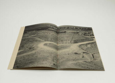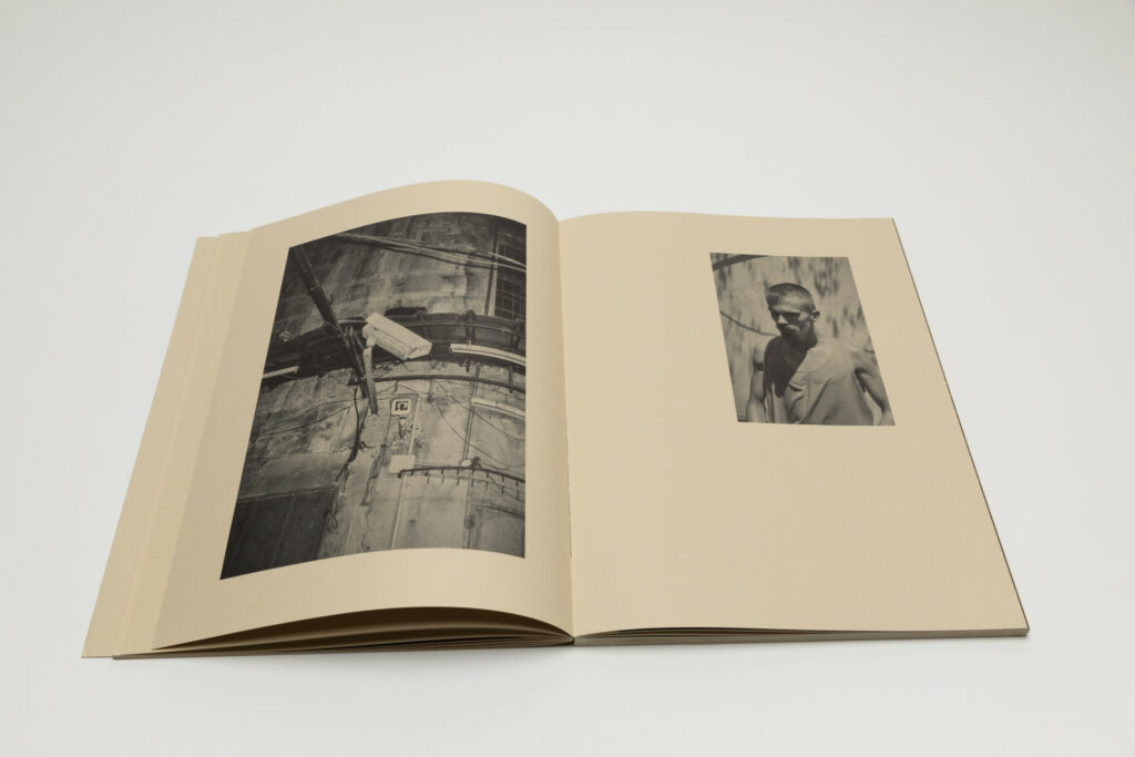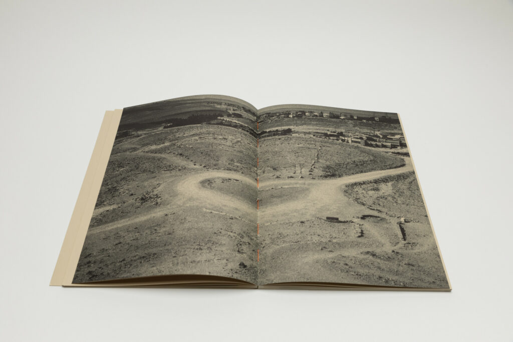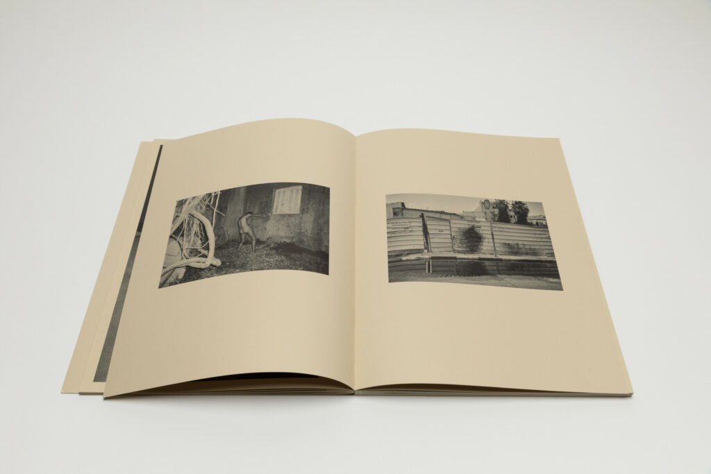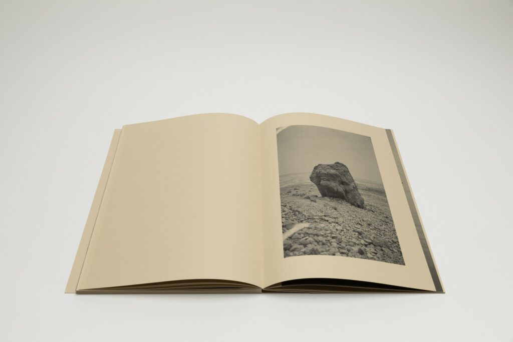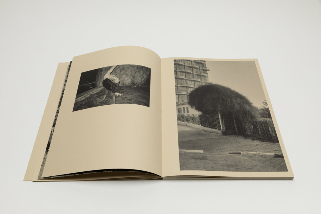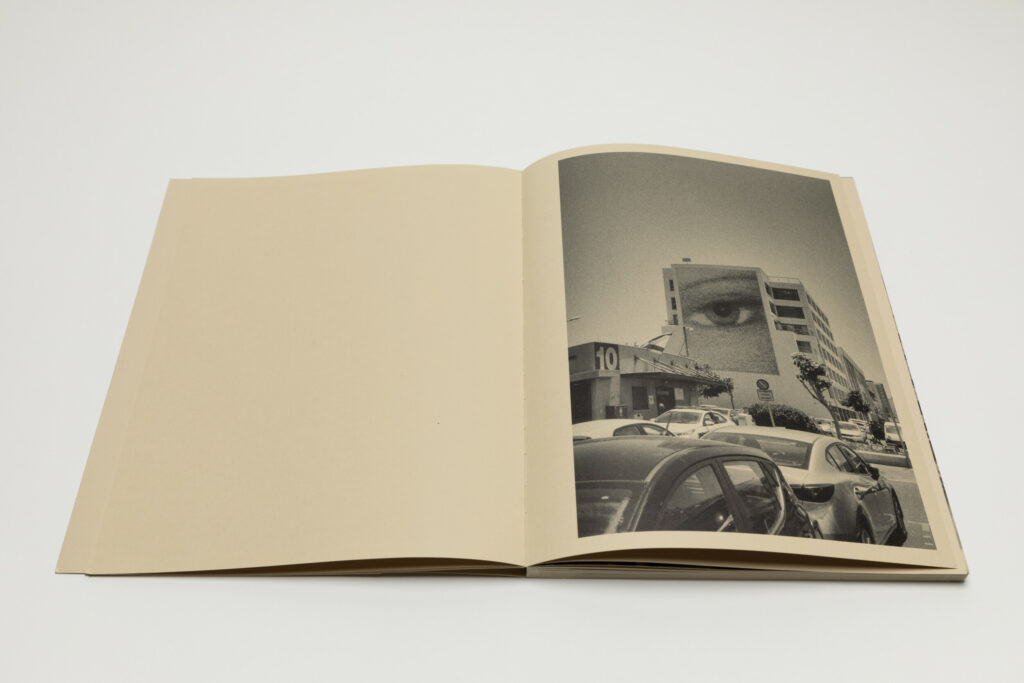 Tsuchiyama says that the title of the book, Heat of Sand, was inspired by the atmosphere he visually felt while taking photographs in Israel, “sand and its heat, affecting the whole environment, coloring the air and buildings.” As a photobook, Heat of Sand seems rather simple, yet its design is very effective. It is a medium-sized softcover book with a dust jacket; a handwritten title in embossed gold takes up the entire cover. The paper, both on the cover and inside, is of a light brown color tone, reinforcing with the connection to sand, and the book has an open spine with visible orange stitches, adding to the physicality of the experience. Inside, the photographs vary in sizes and their placement on pages, creating a visual movement similar to dance.