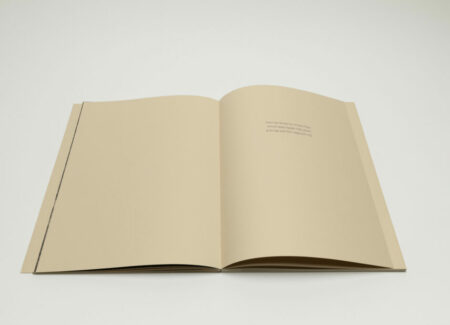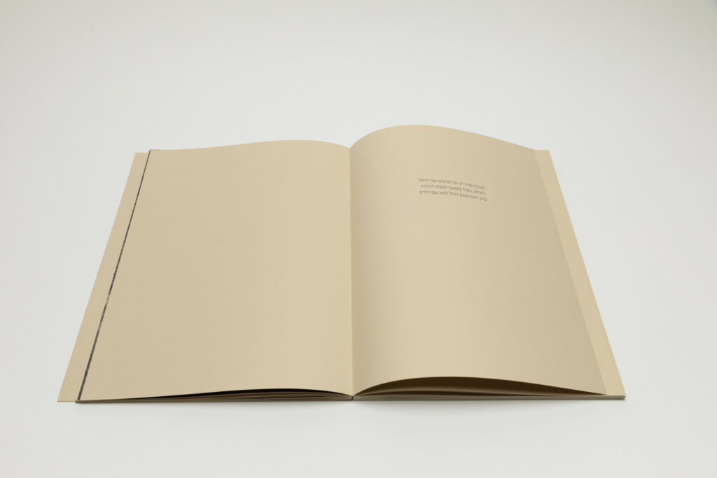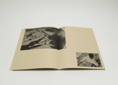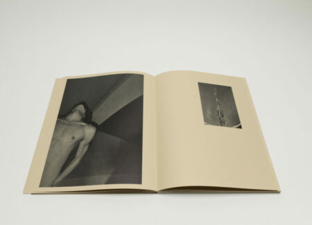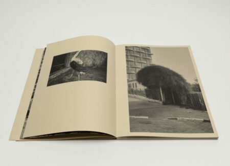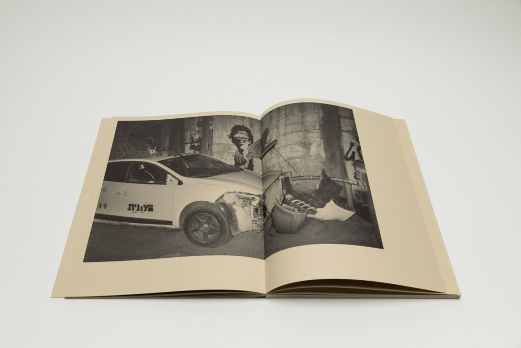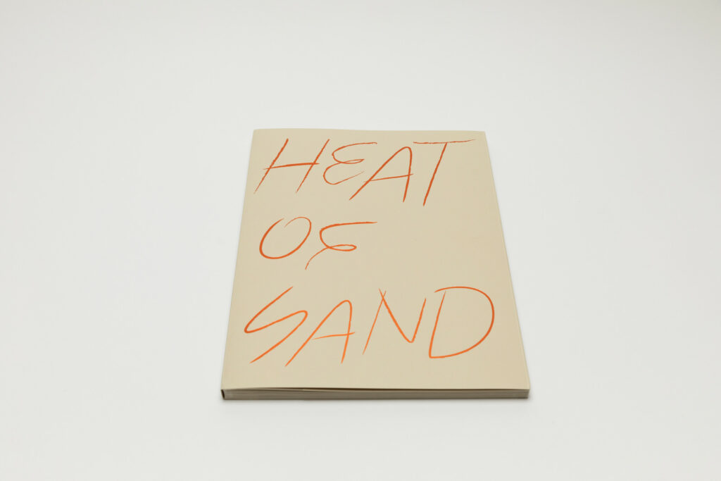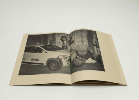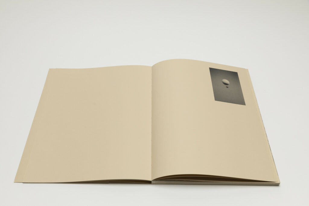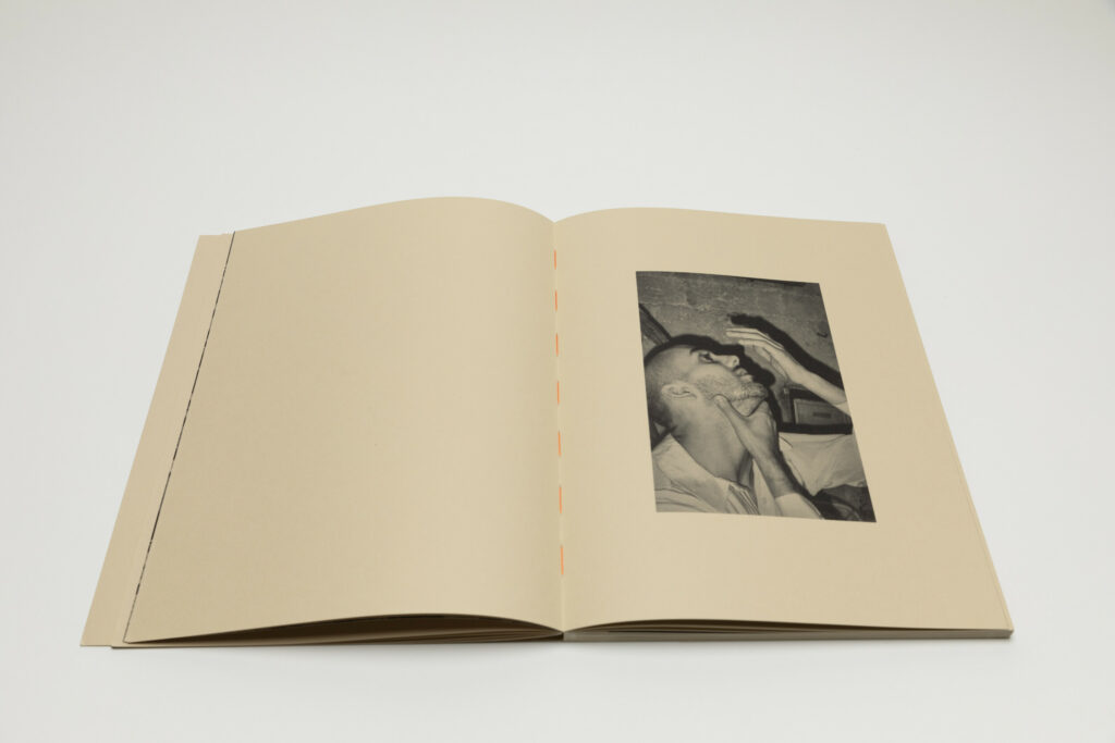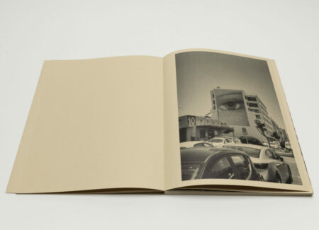 Tsuchiyama says that the title of the book, Heat of Sand, was inspired by the atmosphere he visually felt while taking photographs in Israel, “sand and its heat, affecting the whole environment, coloring the air and buildings.” As a photobook, Heat of Sand seems rather simple, yet its design is very effective. It is a medium-sized softcover book with a dust jacket; a handwritten title in embossed gold takes up the entire cover. The paper, both on the cover and inside, is of a light brown color tone, reinforcing with the connection to sand, and the book has an open spine with visible orange stitches, adding to the physicality of the experience. Inside, the photographs vary in sizes and their placement on pages, creating a visual movement similar to dance.