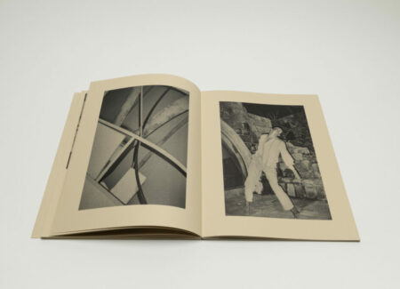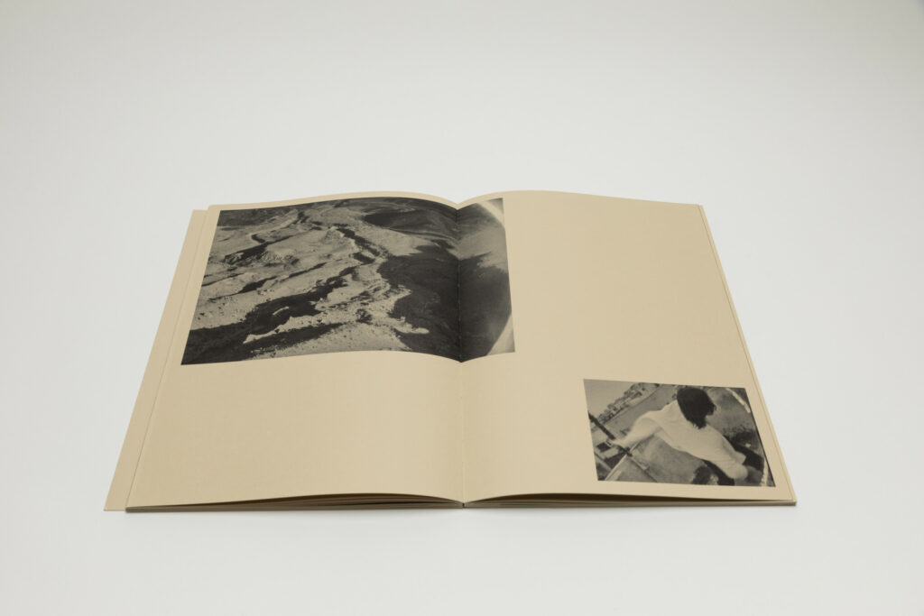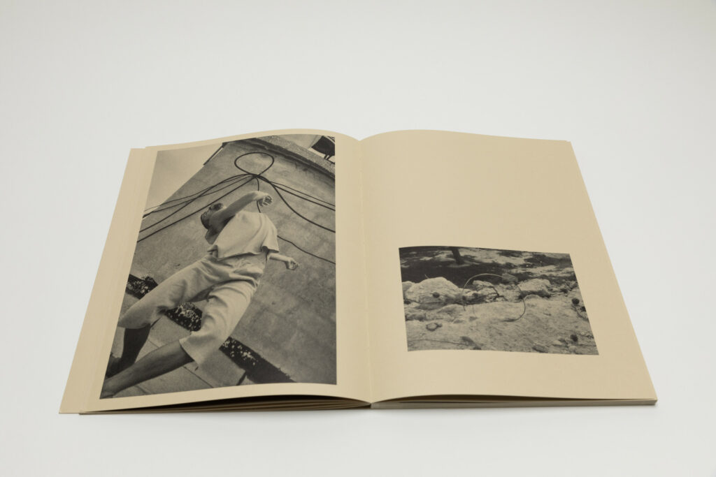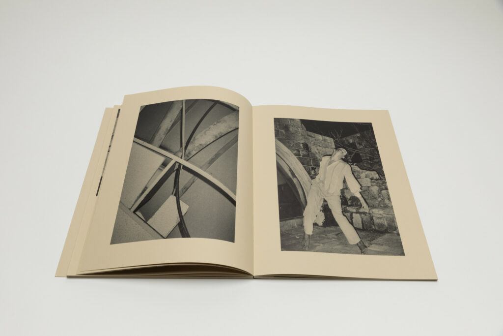 Dessert, surveillance cameras, rock formations, barbed wires, wrecked cars, and architectural spaces appear together with shots of bodies in fluid movements. A close up of a dancer’s body in a movement with his chin up (seen from below) is paired with a smaller picture of a mobile cell phone tower. And the following spread captures another dancer whose motion resembles the shape of a dry tree on the left side of the frame. The narrative unfolds in paired movements like these, back and forth.