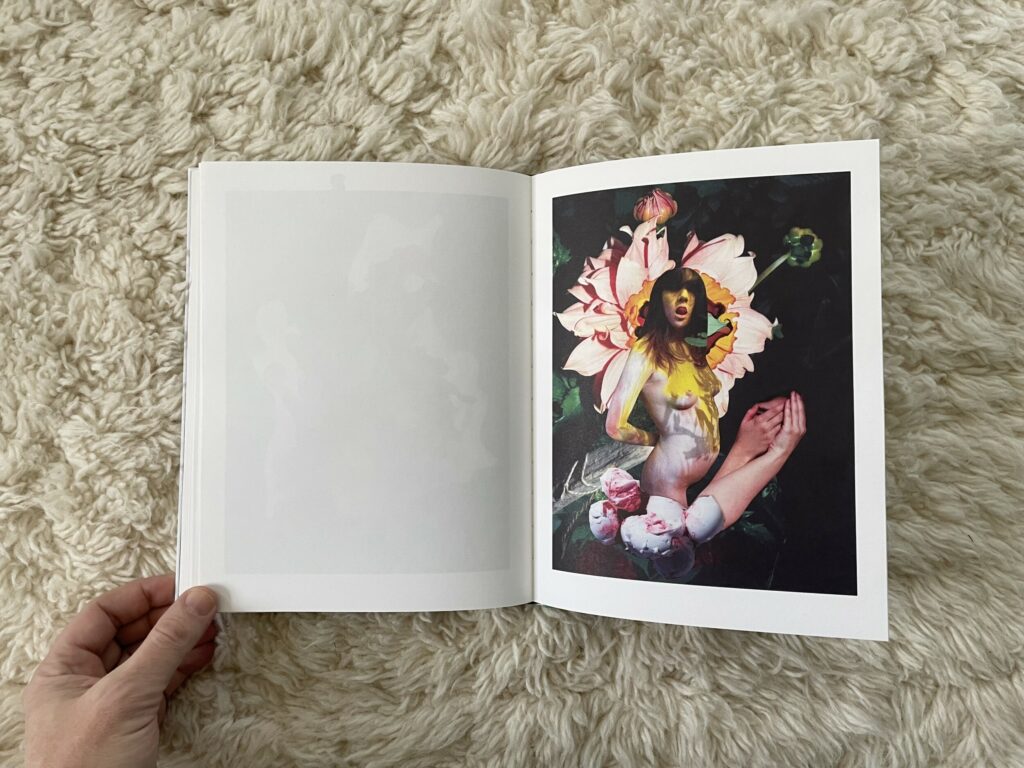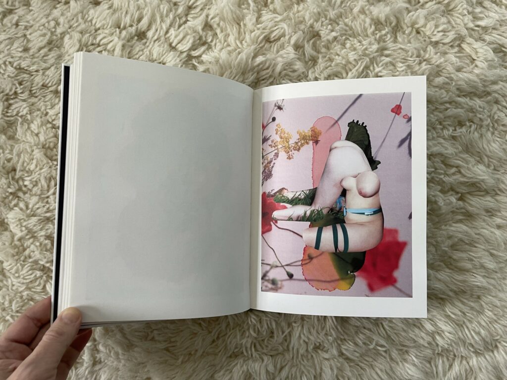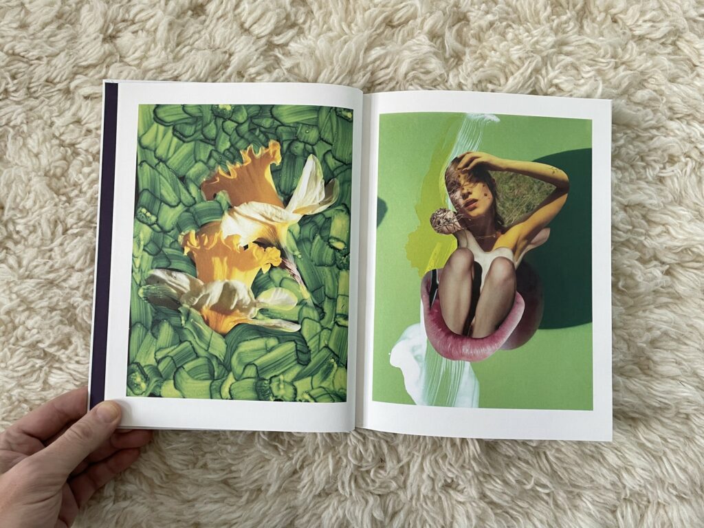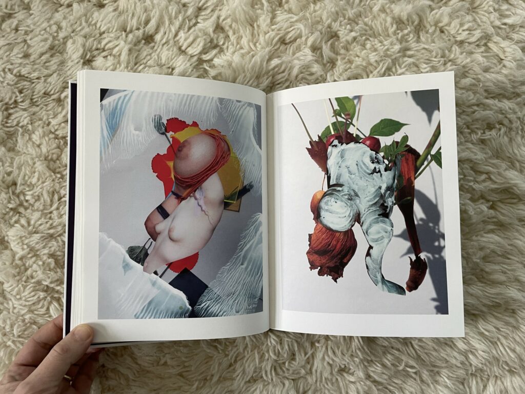 As presented in Modern Alchemy, where the reproductions are moderately sized, there is an intimacy about these works that makes them feel like studies or sketches. This is especially true when the exacting precision of the collaging meets the more chance elements of the ink or the painted brushstrokes, Sassen’s ideas being reworked in ways that aren’t entirely in her control. The strongest of the works in the photobook feel unsettled and interwoven, the forms and textures spliced together and just momentarily in a kind of equilibrium. Many images rely on an unexpected charge of strangeness, where a lizard joins the petals of a flower, colored ink blots echo floral arrangements like neon lights, and body parts are layered into contorted tangles with too many arms, legs, or breasts. Scale and proportion also seem to be entirely malleable, further confusing our sense of what we’re seeing; suddenly full human figures are attached to spindly stems, moth wings mimic brushstrokes, and bent legs are the same size as petal edges. It’s like we’ve tumbled into an alternate universe, where the possibilities for reconfiguration aren’t as rigidly bounded as in our own.