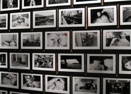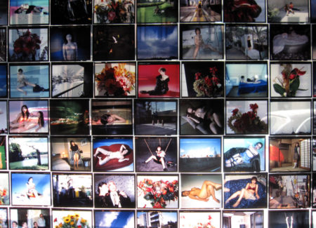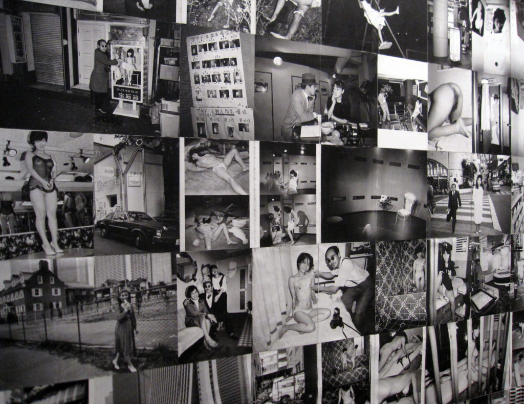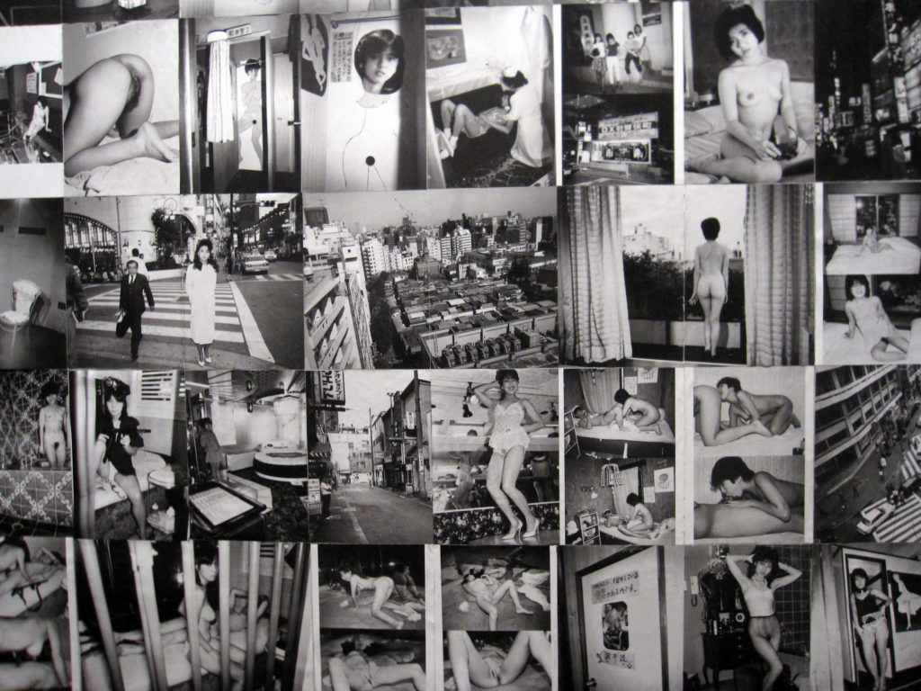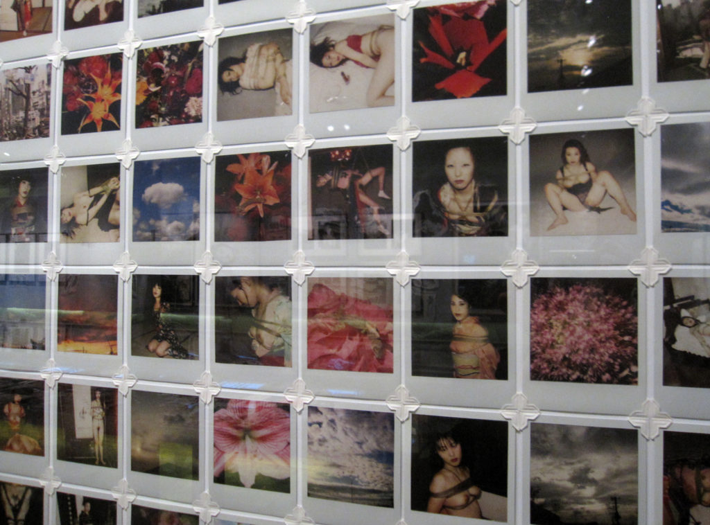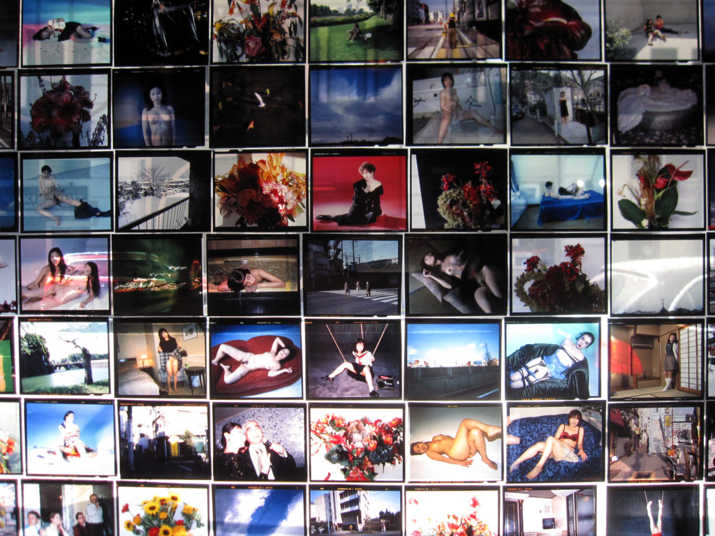 Nearby is a vast grid of black-and-white photographs, taken in Tokyo’s red-light district, of live sex shows and prostitutes with their customers. Interspersed among these unvarnished images of sexual encounters are shots of city train stations, skylines, and buildings, while a number of diptychs pair shots of nude girls sleeping, bathing, and smoking with studies of skies and streets. Ina similar fashion, a gang of color Polaroids jumbles pictures of women, toys, clouds, flowers, cats, and dead lizards.