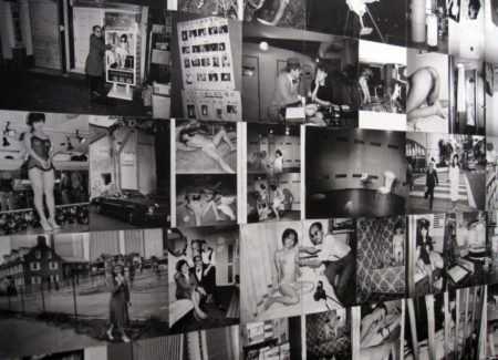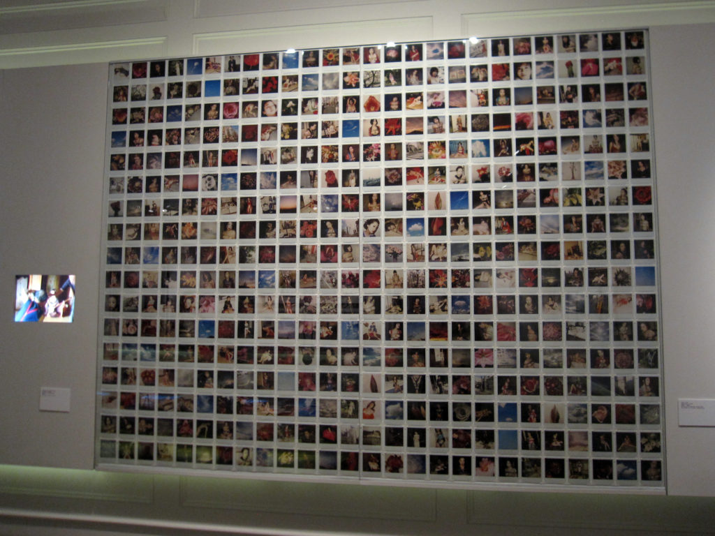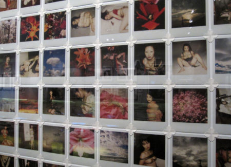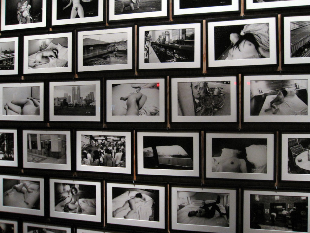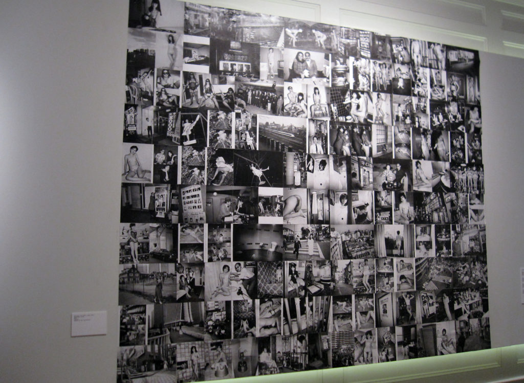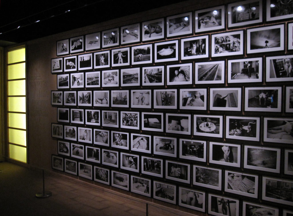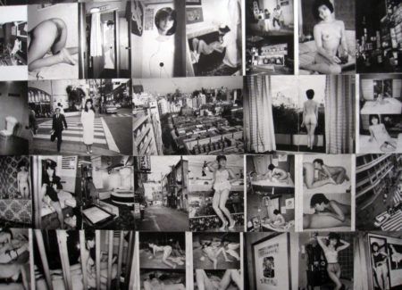 Nearby is a vast grid of black-and-white photographs, taken in Tokyo’s red-light district, of live sex shows and prostitutes with their customers. Interspersed among these unvarnished images of sexual encounters are shots of city train stations, skylines, and buildings, while a number of diptychs pair shots of nude girls sleeping, bathing, and smoking with studies of skies and streets. Ina similar fashion, a gang of color Polaroids jumbles pictures of women, toys, clouds, flowers, cats, and dead lizards.