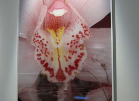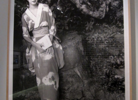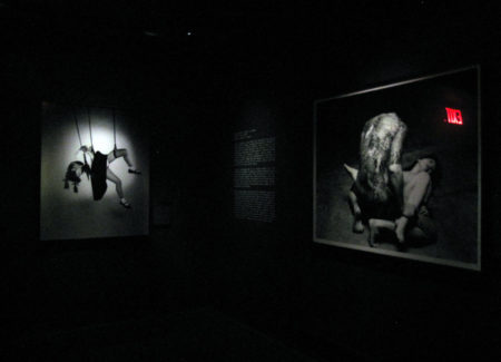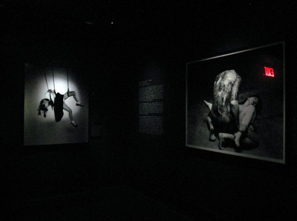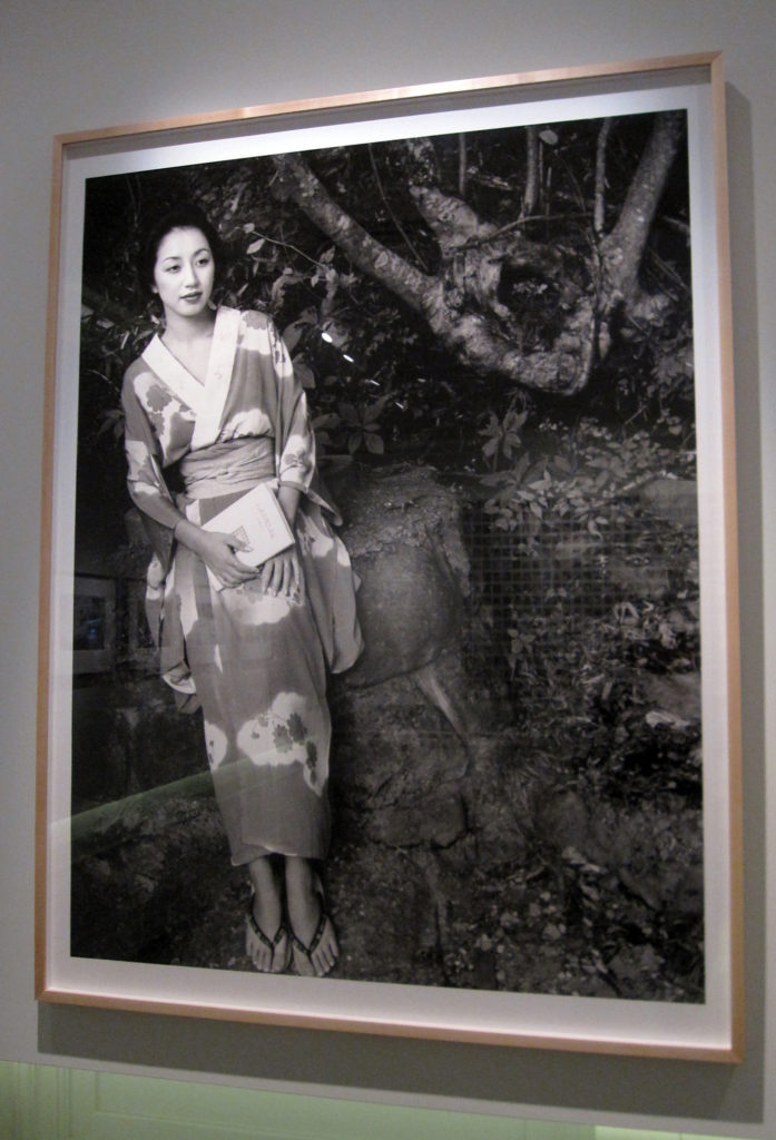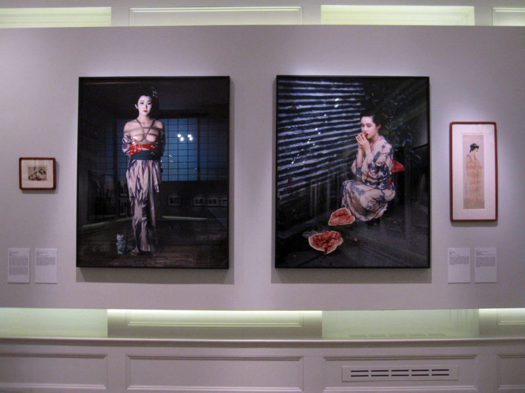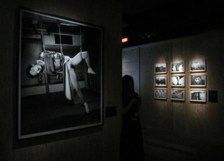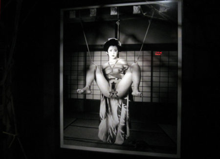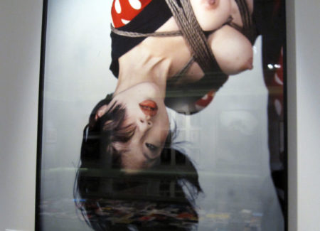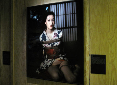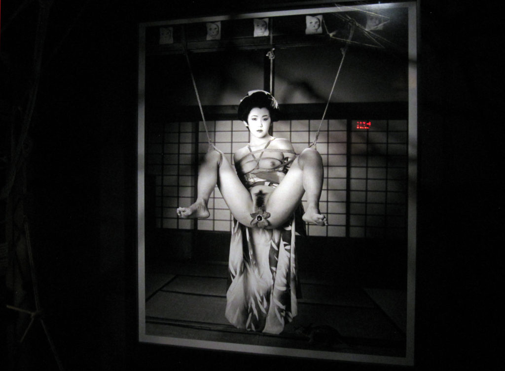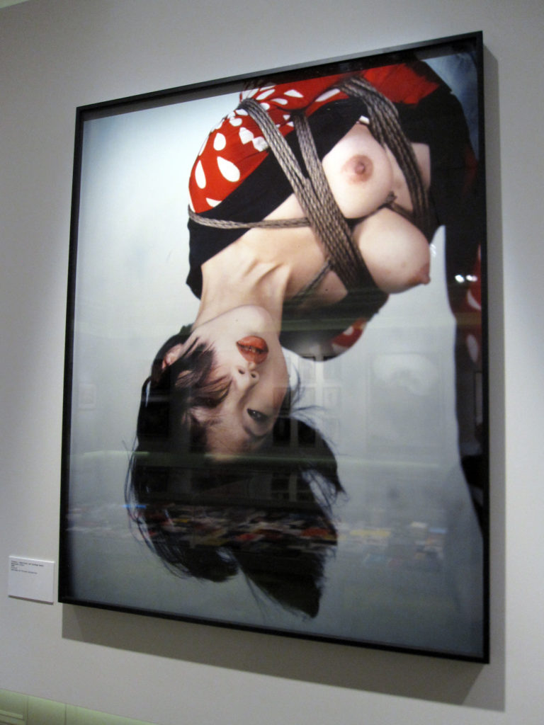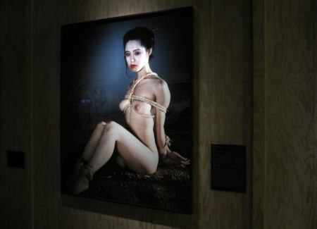 The two-floor exhibition, which is the first major show of Araki’s work in the United States, features over-the-top staging not usually associated with museum retrospectives. A narrow, dark stairwell leads to a passageway lined with rope webbing and ending in a large, dramatically spot-lit photograph of a woman in an open kimono suspended in midair by cords. Elaborately coiffed and made up, she dangles serenely, a flower between her open legs barely covering her vagina.