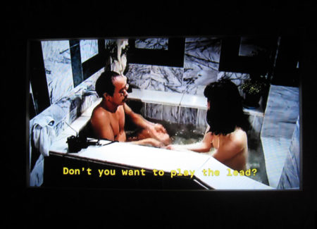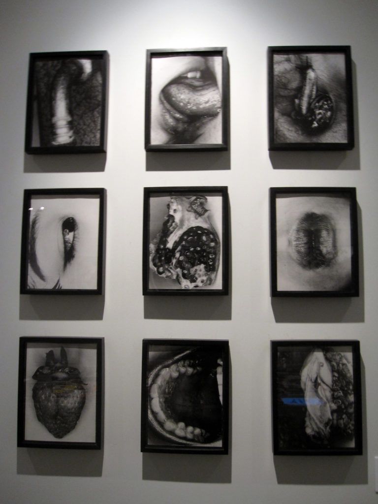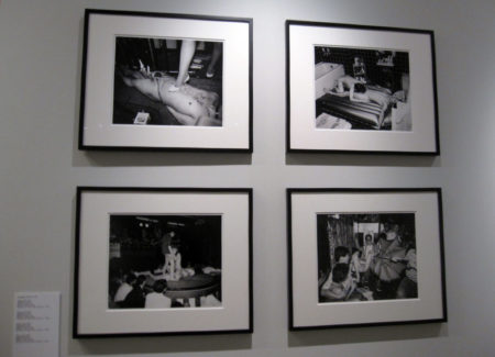 Within, more large-scale photographs hang on rough plywood walls. An image of a heavily tattooed man and a preternaturally pale woman having sex is accompanied by a discussion of Araki’s place as a transgressor in Japan, where tattooing—a sign of membership Japan’s organized crime syndicates—is frowned upon, and obscenity is illegal. In the past, Araki has been arrested and his work confiscated by authorities. In spite of this, or perhaps because of it, he is a celebrity at home and abroad whose fans include Lady Gaga (seen here in a suggestive, but relatively tame photo) and Björk, who enthuses about him in Travis Klose’s documentary film Arakimentari (2004), excerpted throughout the show.