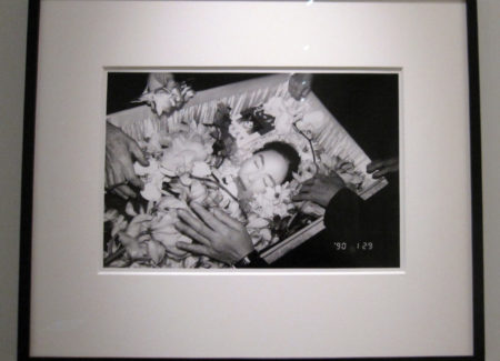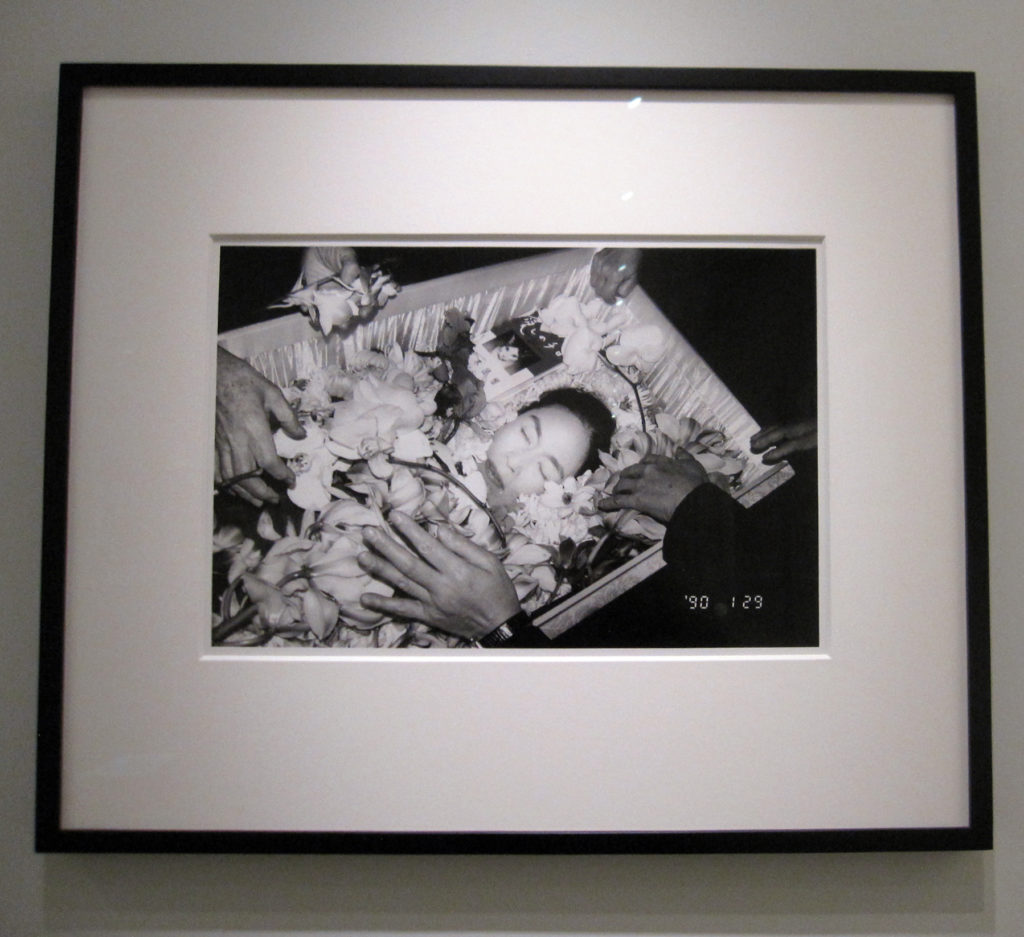 One floor up, the second half of the exhibition opens with four photographs from Araki’s 1971 series “Sentimental Journey,” which he made while on honeymoon with his beloved wife, Yoko. These quiet images, pioneering in their time for their ordinariness, show Yoko nude in bed post-coitus, asleep in a boat, and seated primly, with her purse in front of her, on a train. They are followed by a heartbreaking picture of Yoko in her coffin after her 1990 death from ovarian cancer.