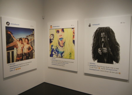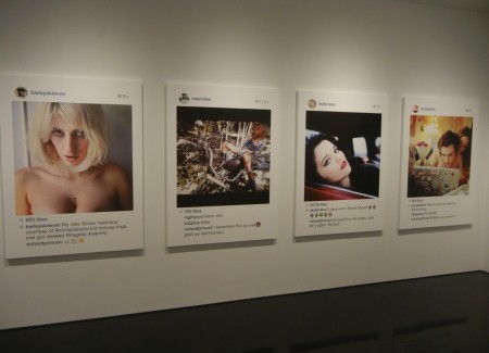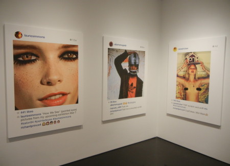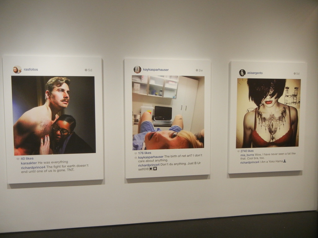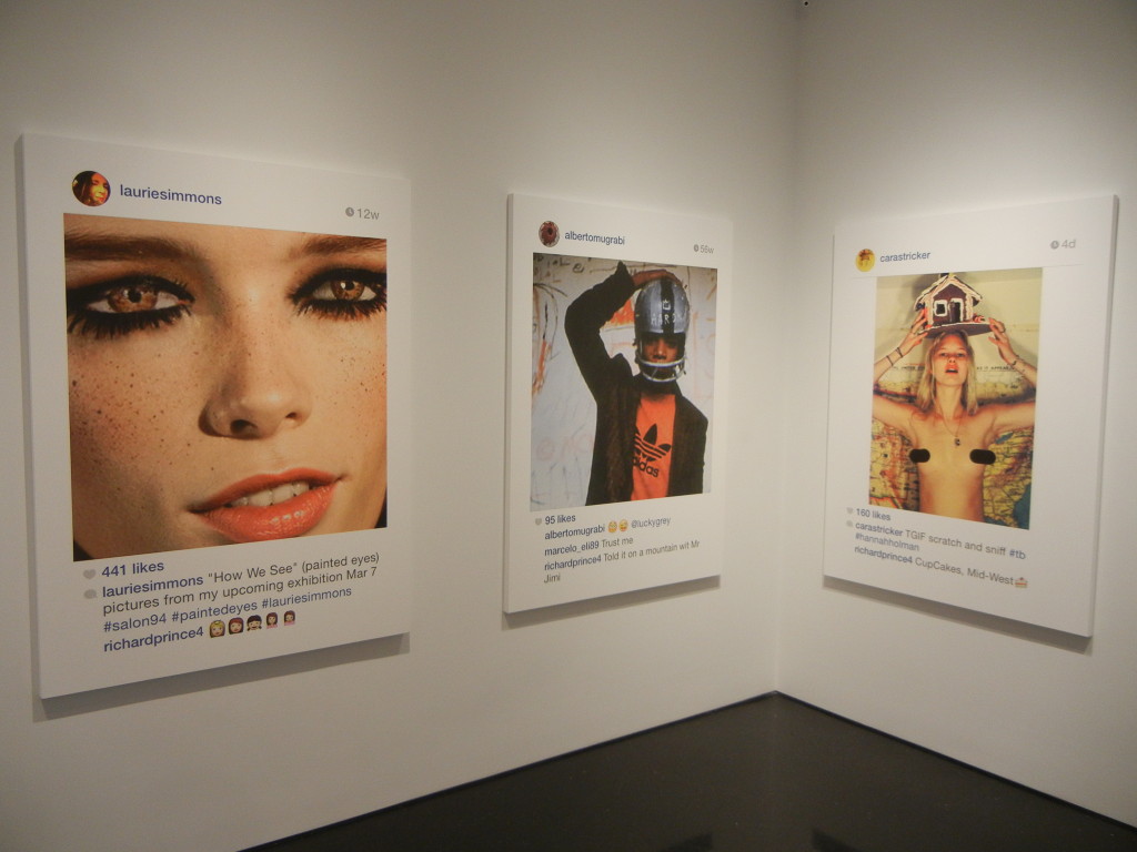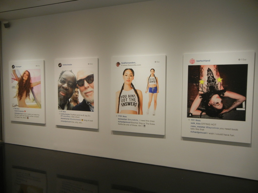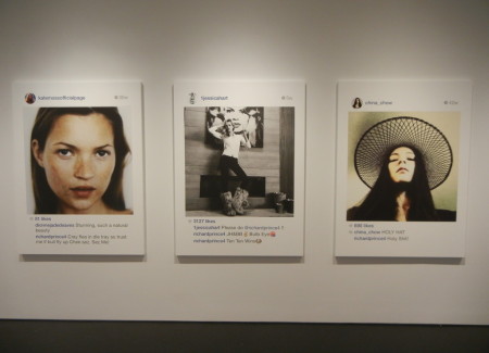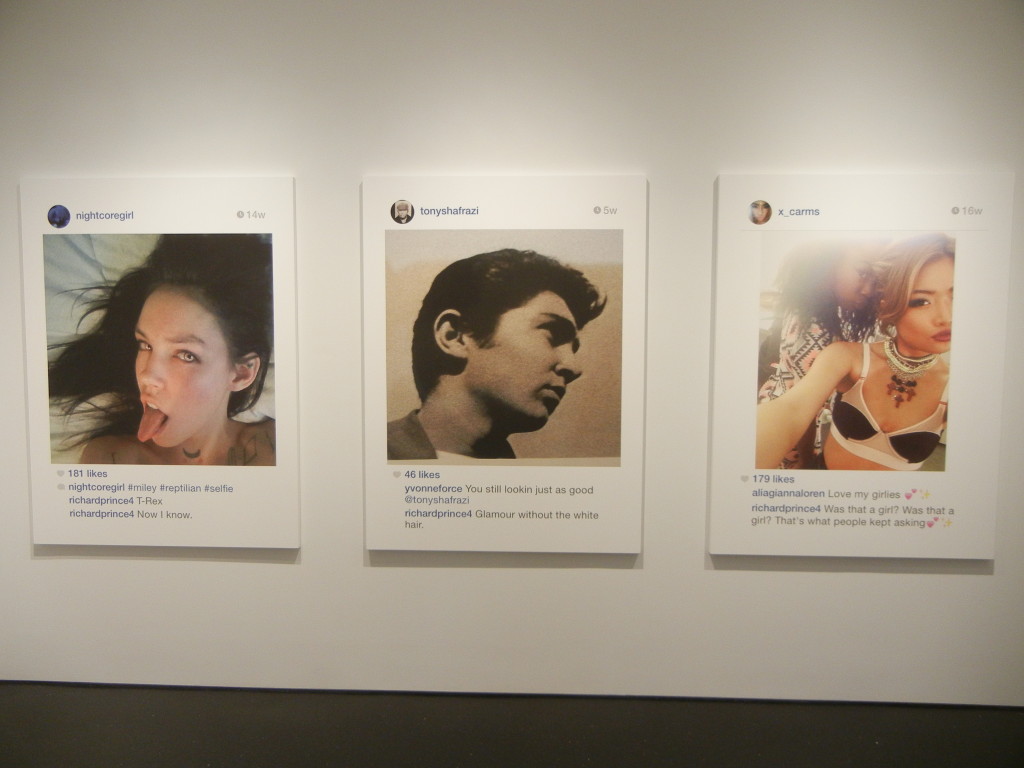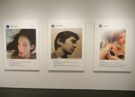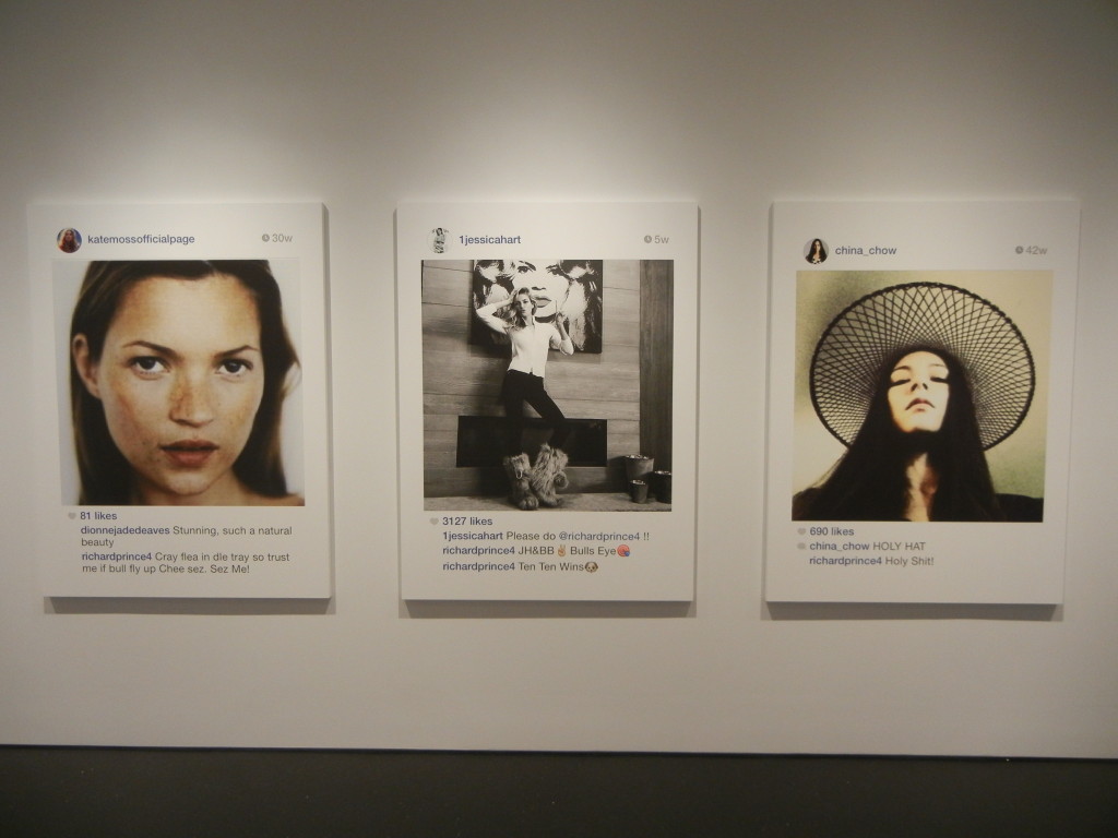 Given the cultural ubiquity of the selfie and all that it represents about changing attitudes to privacy, our obsession with fame and celebrity, and the burgeoning discipline of personal identity management, it should come as no surprise that Prince has turned his attention to appropriating selfies; they’re a perfect fit for his brand of cultural commentary. What’s intriguingly different about using these pictures is that he’s no longer at arms length. All of the other photographs he has ever appropriated were in a sense anonymous to him; he was working with them in a manner far removed from their original purpose. Here he’s engaging in a kind of participatory appropriation, where the artist persona of Richard Prince is actively and publicly involved with the actual person in the photograph (or his or her fanboy proxy), alternately adding to or drafting off of his subject’s relative celebrity (from Pamela Anderson and Kate Moss to Internet unknowns). He’s parachuted into their lives like a party crasher, alternately adding to the fun or playing the jackass. And he’s not hiding in the background as an ivory tower artist – he’s openly engaging all who come at him.