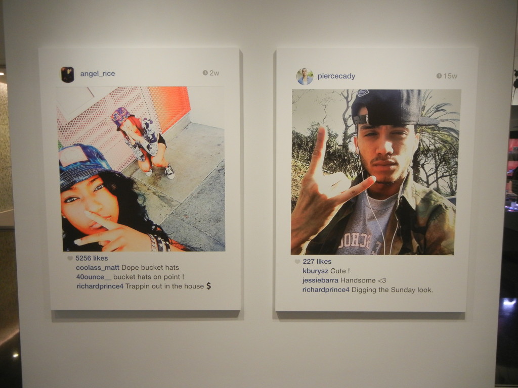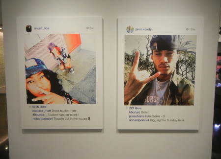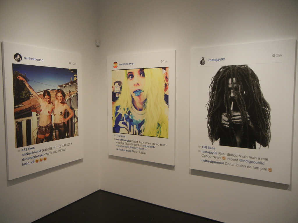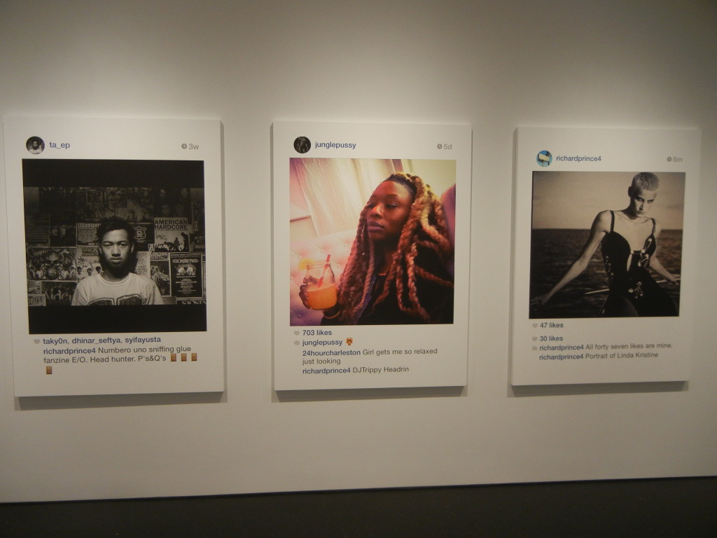 Process-wise, Prince’s inkjet paintings are Instagram images that the artist has discovered/selected, commented on, rephotographed with his iPhone, and then enlarged/printed out on canvas. (For those that feel the need to wrangle over “inkjet paintings” not being photography, a deeper analysis of the relationship between the two can be found here.) The change in scale is important, as it transforms the intimate, shared-in-your-hand, personal (and arguably somewhat private) feel of Instagram into an experience with powerful public wall presence; these faces look down with vitality, with a shout of attention grabbing look-at-me size that amplifies their original energy.
