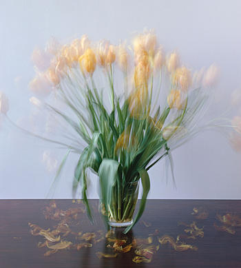 If you’ve ever bought a bunch of tulips at the market, jammed them into a vase and left them on a table for a week or so, you’ll know that the straight stems quickly bend and bow over, and the flowers gradually open up and drop their petals. While other photographers have documented the end point decay of all kinds of flowers (often as withered, dried up, or dusty husks), Wesely is the first I have encountered to have effectively captured all of the intermediate steps; the photographs document the entire process of aging, not just the final result. (2.2-12.2.2007 (B2906) at right, via Fahnemann Projects.)