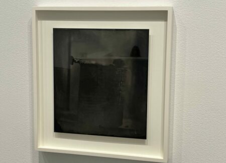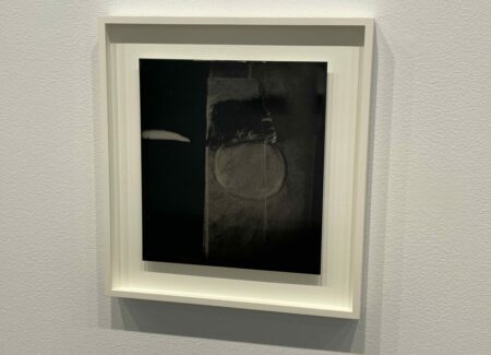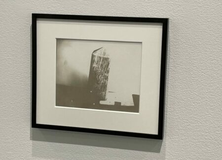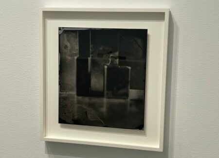 In her platinum/palladium prints, Mann opts for a much lighter atmosphere, where ethereal nuances of whites and off-whites are the defining values. The works ostensibly document gravestone fragments found at a stonemason’s workshop near her Virginia home and brought into her studio, but the images drift into indistinct fuzziness, with weathered edges and craggy blocks offering all the subject matter necessary for Mann’s meditations. A few slabs with faint inscriptions help orient us, but largely the worn rock is featureless, which Mann then softens further with fleeting glimpses of dirty textures, rounded facets, and cast shadows. What is left behind is a sense of mute (or silenced) presence, the specific personal histories these stones once commemorated now forgotten or withheld. In both the tintypes and the platinum/palladium prints, Mann amplifies the possibilities of her modest subject matter via the expressiveness of her photographic processes, the imperfections and chance elements of the pictures heightening their sense of ambiguity and obscurity.