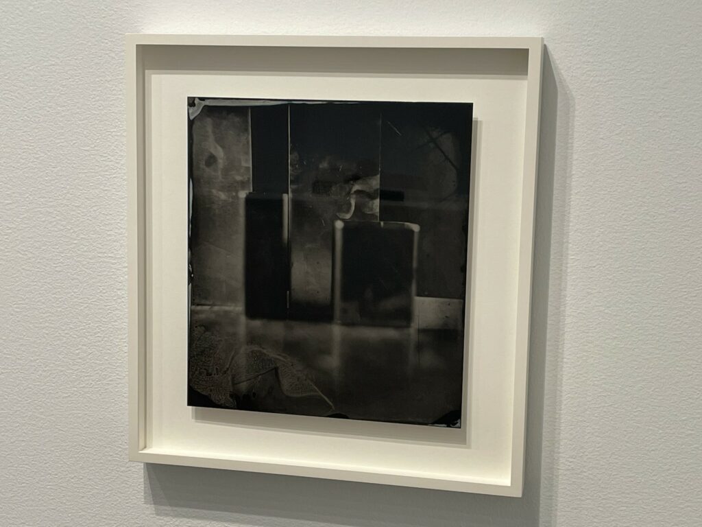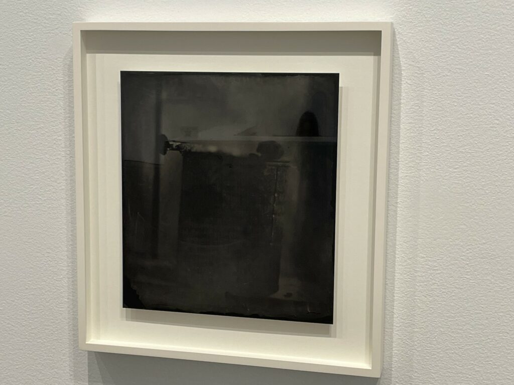 Mann brings two projects to this exchange, a set of tintypes (made in 2020) and a group of platinum/palladium prints (made in 2022). The tintypes are decently large, at least in comparison to what we might expect from 19th century examples using the same process, and are universally dark and moody. Out of the deep shadows and dark chemical washes emerge hints of small still lifes, but even up close, accurate identification of the subjects is extremely difficult. Might that be a pair of lemons, some rusty tools, some railroad ties perched on a can, a flask and some bottles, a stone vase or urn, or some wooden hangers? It’s hard to be sure, but of course, specificity isn’t what matters here.