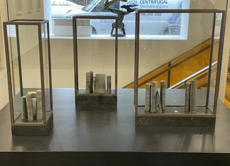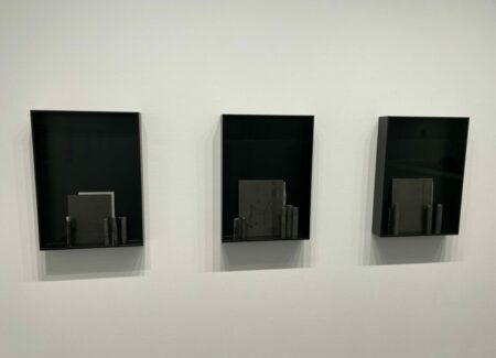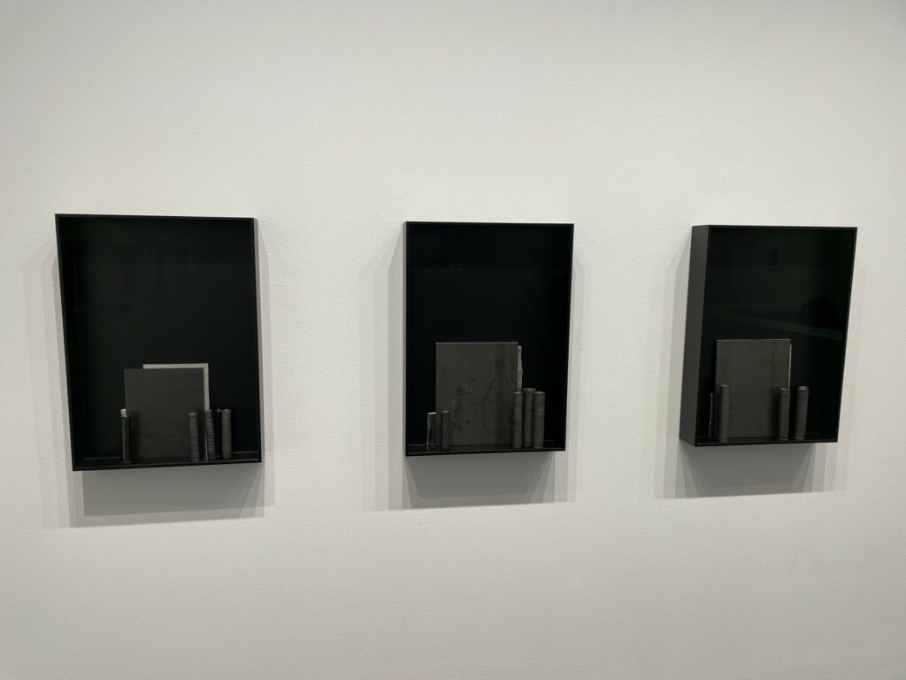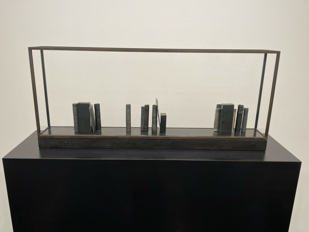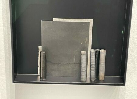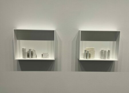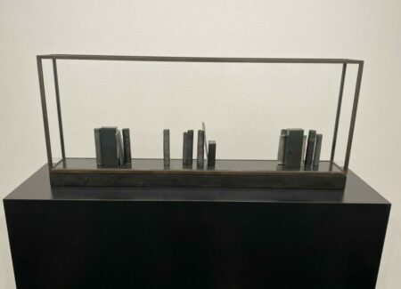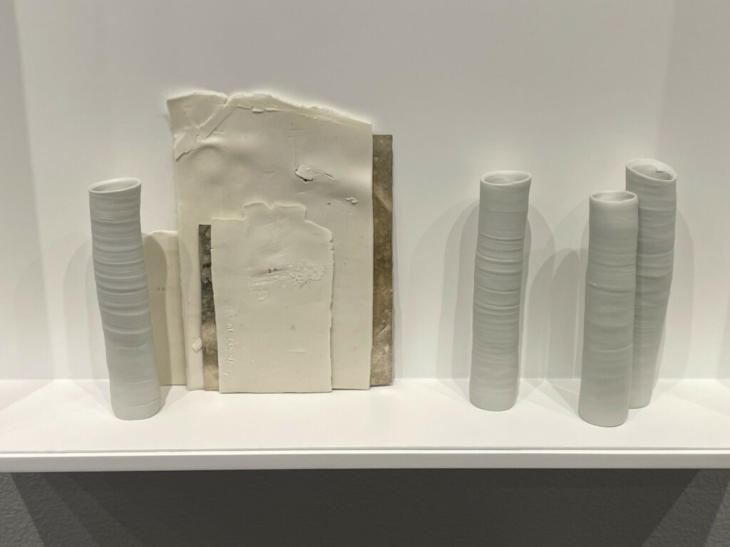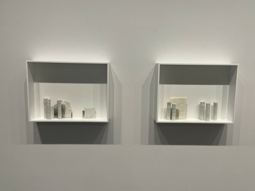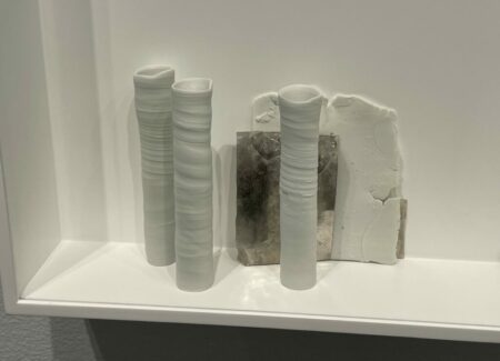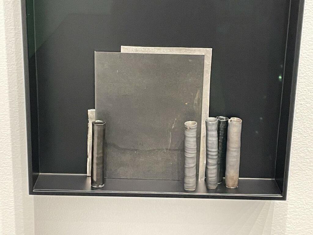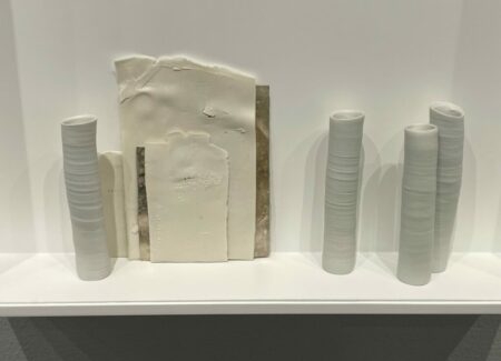 In both black/grey and white palettes, de Waal gathers arrangements of upright tubes, flat plates/sheets, and blocks, each arrangement composed with precise attention to subtleties of visual balance and rhythm. But it is his rich tactile surfaces that give these works their life. The tubes have rolled and ribbed striations, and are covered with glossy glazes in a range of gloriously subtle tones; the sheets are variously shiny and metallic, dull and mottled, crackled and veined (when marble), and other opaque versions of creamy ceramic; and the steel boxes are harder edged and unforgiving. When combined together, de Waal’s sophisticated assemblages play with round/flat/square proportions, ranges (and opposites) of surface texture, and patterns of short/tall, thick/thin, and in front/behind, each work an expressive iteration within defined constraints.