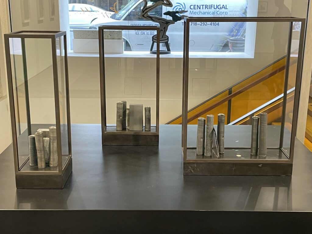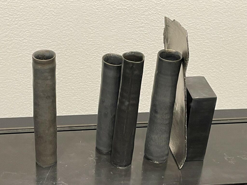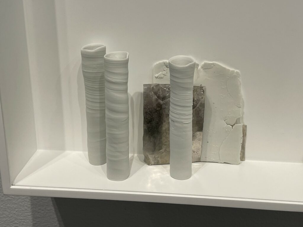- 3 porcelain, Cor-Ten steel, platinum, aluminum, and glass, 2023, sized roughly 28x20x4 inches, unique