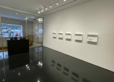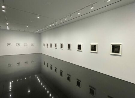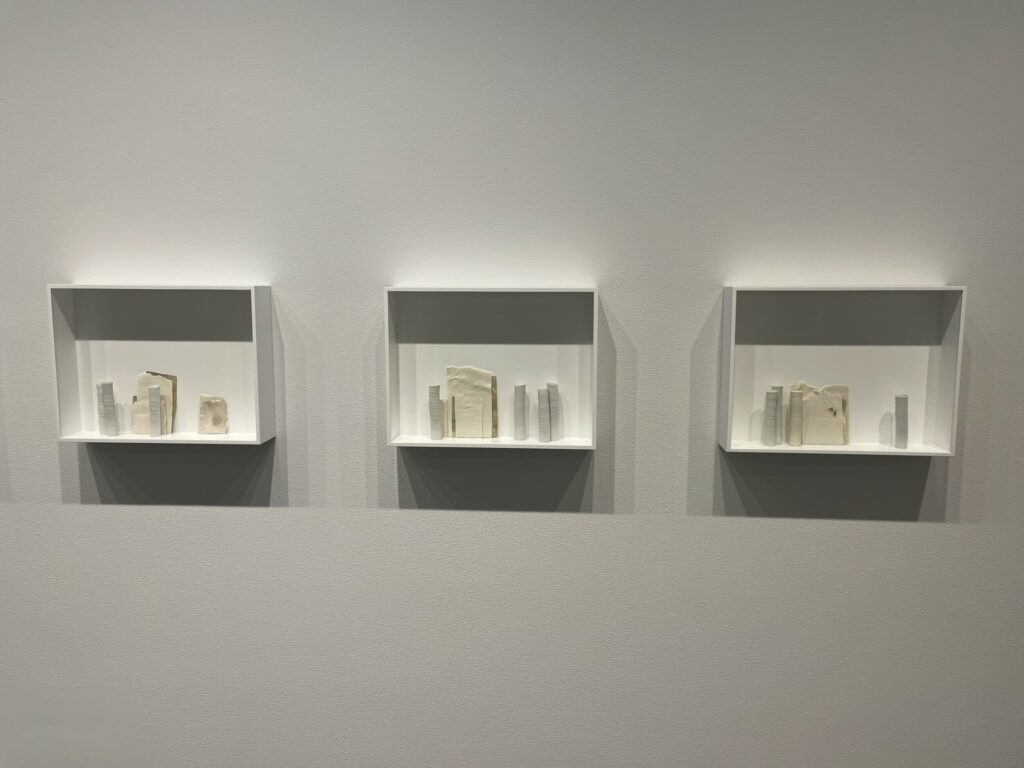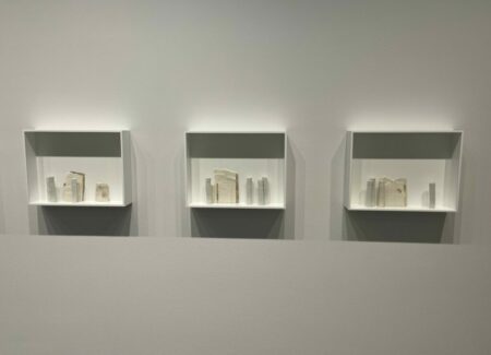 Edmund de Waal’s recent sculptural assemblages wrestle with many of the same aesthetic concerns as Mann’s photographs, albeit in three dimensions instead of two. De Waal’s works are shown in two forms – as hanging wall objects, where small porcelains and other collected items are housed in deep frames that act like a shelf with a flat back, and as stand-alone sculptural arrangements enclosed in glass vitrines. In contrast to the ephemerality of Mann’s photographic moments, de Waal’s works have an immediate physicality and spatial presence, which is then minutely modified by shifting light conditions in the gallery.