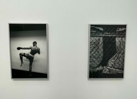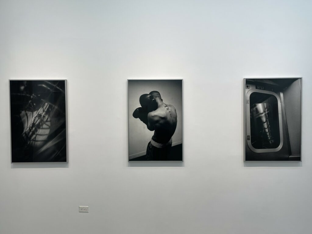 The only two photographs in the show that might be called portraits capture a man named John shadowboxing against a blank wall. Pérez is a boxer themself, and their choice of poses highlights a mix of power and vulnerability. One image finds John covering up with his gloved hands, with sweat beaded on his bare back; in the other, he stretches out with one leg bent, seemingly about to kick, his arm extended and his body open. The two could easily be hung as a diptych, the opposing forces and instincts balancing each other.