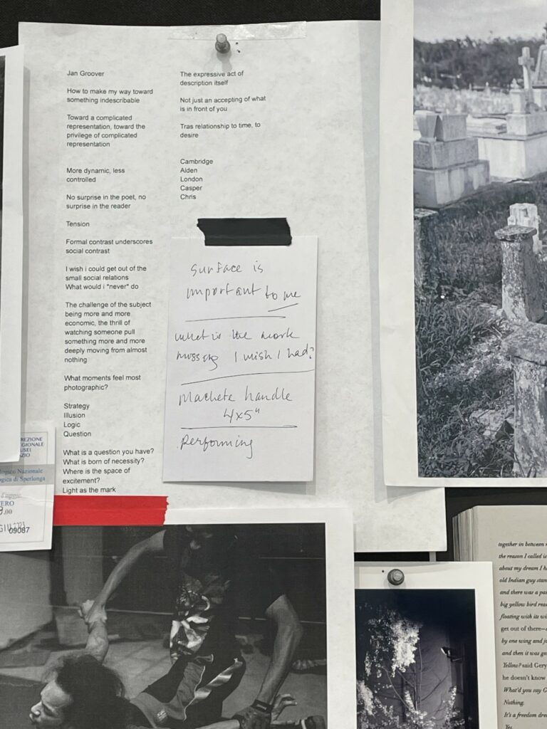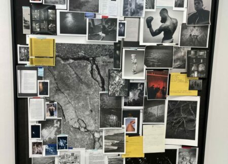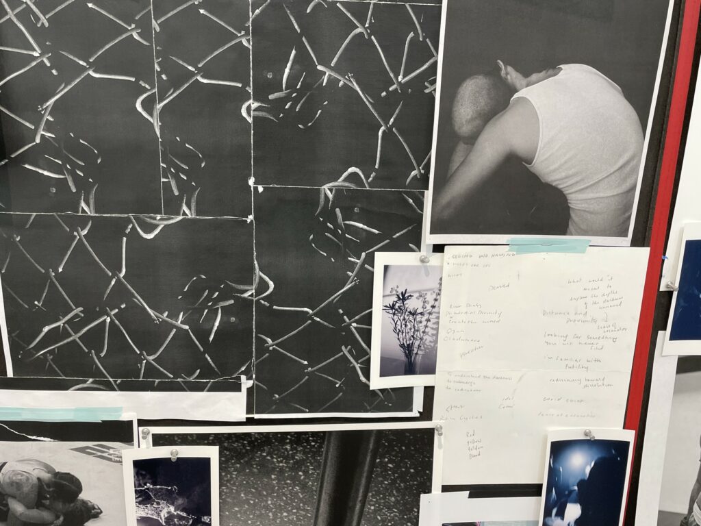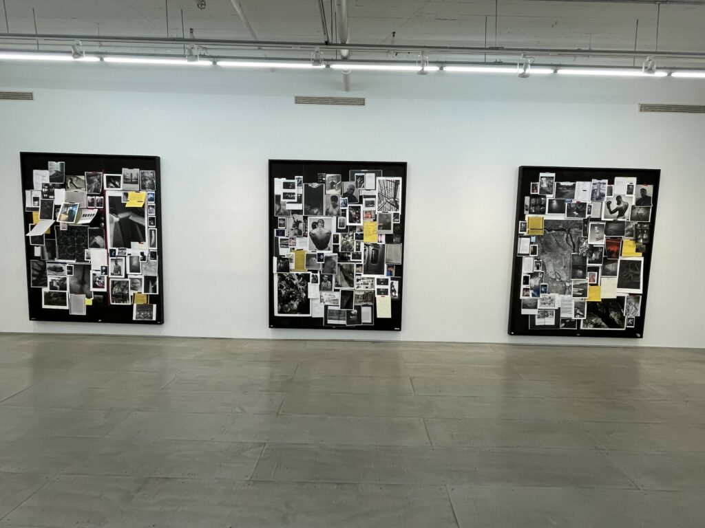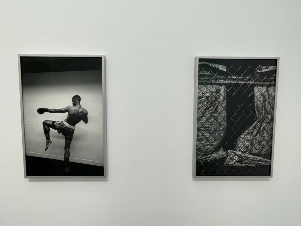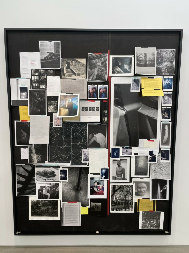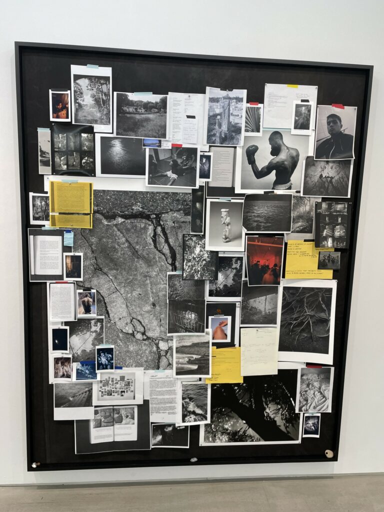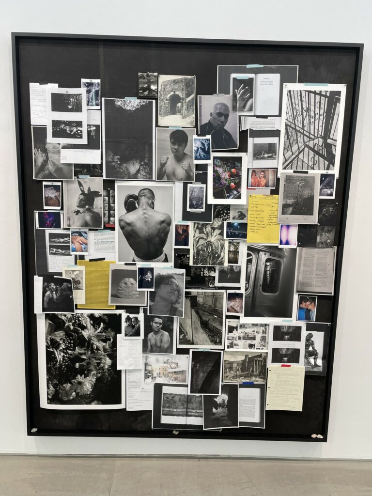 Pérez then leverages the boxing motif one step further, using black padded mats (from the gym) as the substrate for a set of three large scale collaged works, each of which includes a variant image from the boxing shoot in a prominent location. Each work is an assemblage of prints in various sizes (in both black-and-white and color), found imagery, book plates, images of text pages with underlining, and gatherings of lists and note pages (both printed and hand-written). More than mood boards but less than structured arguments, these works follow along as Pérez makes formal and visual connections, tries out combinations, and generally thinks things through, the richness of their ideas coming through strongly. In particular, the texts and note pages allow us to loosely follow their train of thought, the surrounding imagery reinforcing themes and motifs they are exploring. Cracks and dark lines seem to anchor two of the assemblages, while the third mixes florals with bodies and voids, the intermittent text monologue peppered with questions and impulses and the nearby imagery filling out checklists of subjects and gestures. The result is something akin to layered stream of consciousness, where the work of the mind is directed and intentional, while still being artistically open-ended and searching. These assemblages recall Lyle Ashton Harris’s studio wall collages, but with even more intimate windows into Pérez’s churn through conceptual and aesthetic possibilities.