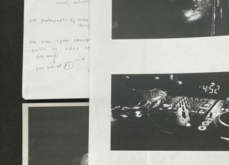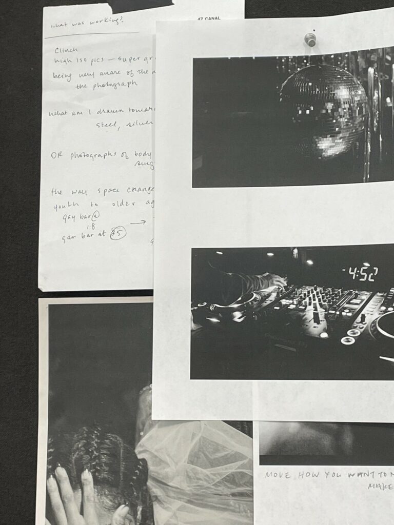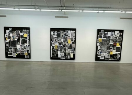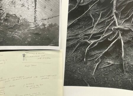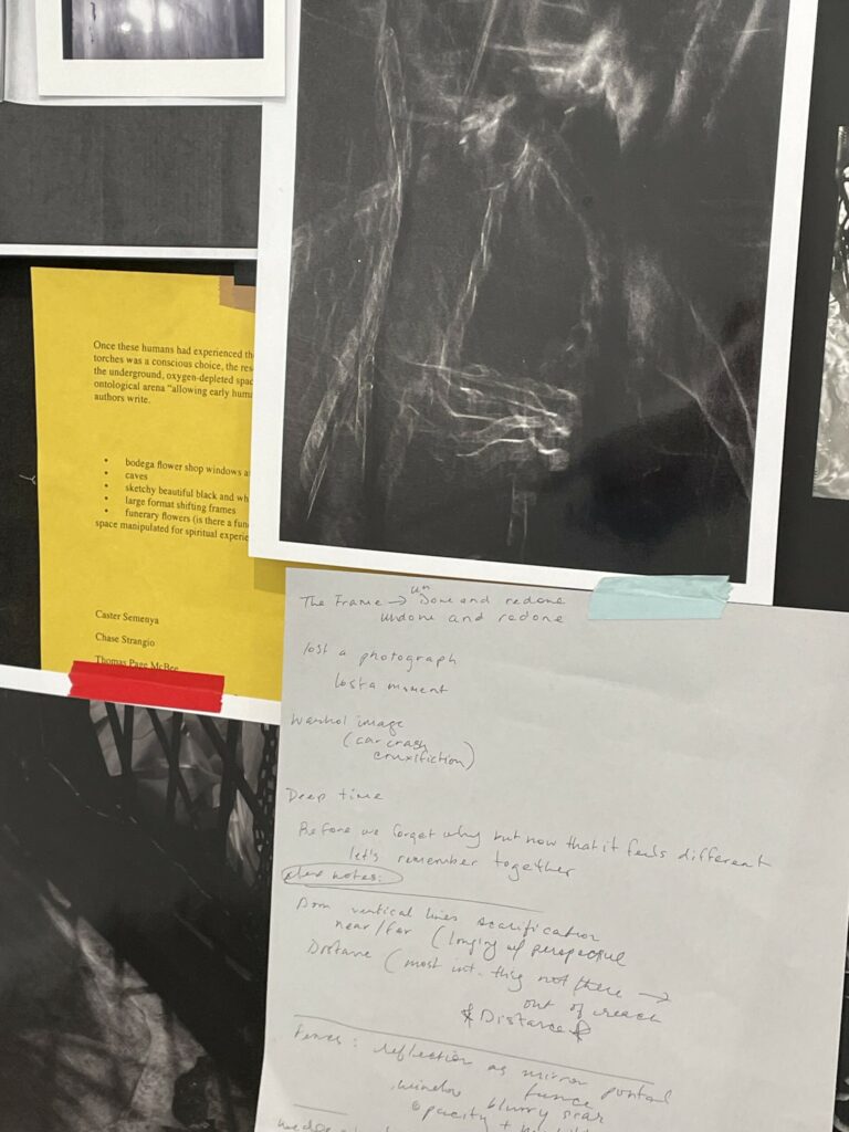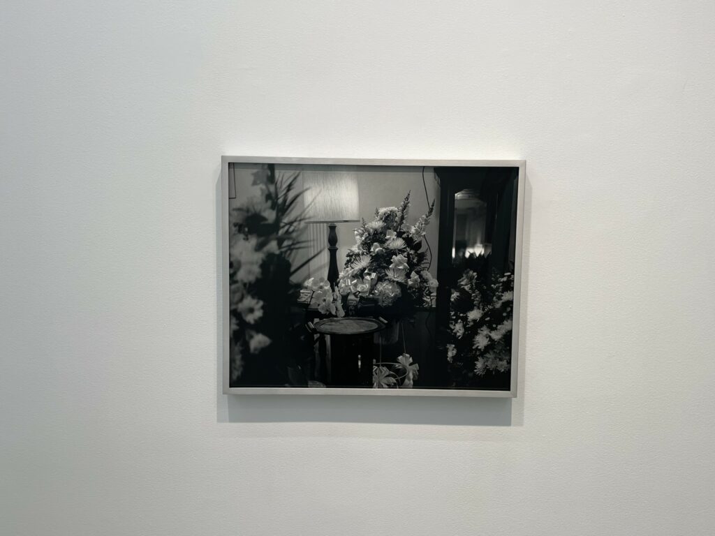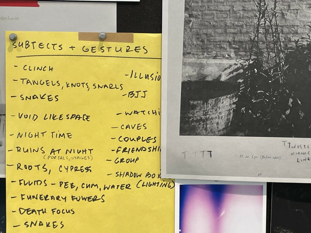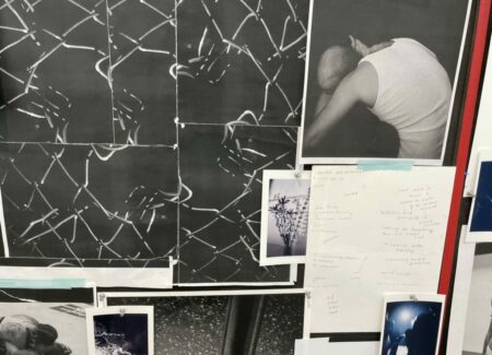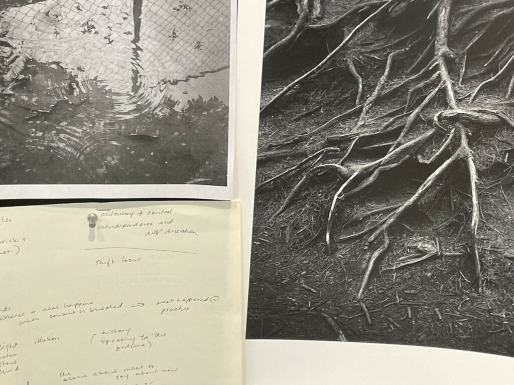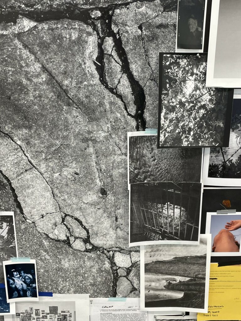 Pérez then leverages the boxing motif one step further, using black padded mats (from the gym) as the substrate for a set of three large scale collaged works, each of which includes a variant image from the boxing shoot in a prominent location. Each work is an assemblage of prints in various sizes (in both black-and-white and color), found imagery, book plates, images of text pages with underlining, and gatherings of lists and note pages (both printed and hand-written). More than mood boards but less than structured arguments, these works follow along as Pérez makes formal and visual connections, tries out combinations, and generally thinks things through, the richness of their ideas coming through strongly. In particular, the texts and note pages allow us to loosely follow their train of thought, the surrounding imagery reinforcing themes and motifs they are exploring. Cracks and dark lines seem to anchor two of the assemblages, while the third mixes florals with bodies and voids, the intermittent text monologue peppered with questions and impulses and the nearby imagery filling out checklists of subjects and gestures. The result is something akin to layered stream of consciousness, where the work of the mind is directed and intentional, while still being artistically open-ended and searching. These assemblages recall Lyle Ashton Harris’s studio wall collages, but with even more intimate windows into Pérez’s churn through conceptual and aesthetic possibilities.