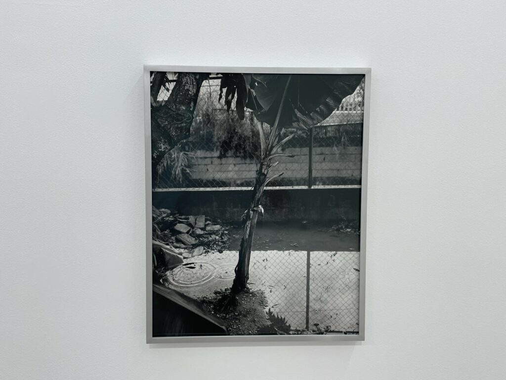 Several images use flooding (presumably in Puerto Rico) as a compositional element, with watery reflections, seepages, and shiny surfaces activating what might otherwise be mundane observations. In one photograph, the water rises over the curb to meet the angled line of a chain link fence; in another, a look down at a flooded area is decorated with the dark reflections of nearby trees and plants overhead, as well as the pattern of the fence again; and in a third, lazy droplets interrupt the flat reflecting surface of the floodwaters which have overrun a walled in area. In each case, Pérez makes sophisticated compositional use of the available tonalities and reflections, using layering and doubling to enrich the complex visual confusion.