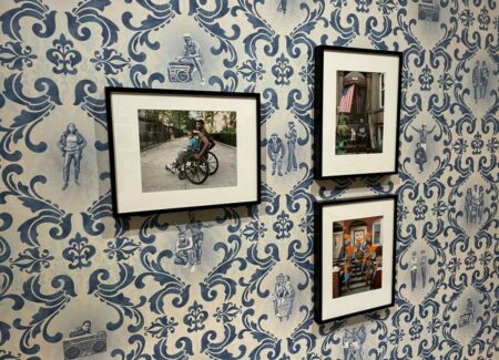 Still other photographers included in “New York Now: Home” have turned their attention to the quirks and eccentricities of New Yorkers and their apartments, including Linda Troeller’s images of the inhabitants of the famous Chelsea Hotel and Sally Davies’s East Village portraits, including one couple sitting with their two dogs on two red high-heeled shoe-shaped chairs. Given the close proximity between New Yorkers in their apartments, there are also plenty of studies to be made of neighbors, roommates, and pandemic-era lockdown families, as seen here in Gail Albert Halaban’s image of a Greenwich Village building on Valentine’s Day (with various scenes playing out in the apartment windows), Neil Kramer’s comically posed images with his mother and his ex-wife, and an unlikely photographic collaboration between Chantal Heijnen and her six-year-old son Lou van Melik, with each making pictures during the lockdown, his made from the backseat of the car during short excursions from their home in Harlem.