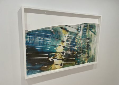 The strongest of these new layered works use both the movement of the chemicals and the edges of the paper with risk-taking abandon, creating juxtapositions that fight with each other, and yet find their way to some kind of uneasy equilibrium. The works that take echoes of stripes and repeat (or reorient) them are too easy; Robertson is at her best on the knife edge of control, where the compositions threaten to blow apart with the force of opposing magnets. Four or five explosions mixed into a shifting pile is more her speed, with echoes of drips, slashes across the pictures, and the lines of the paper edges linking the aggregate images into something approaching visual coherence.