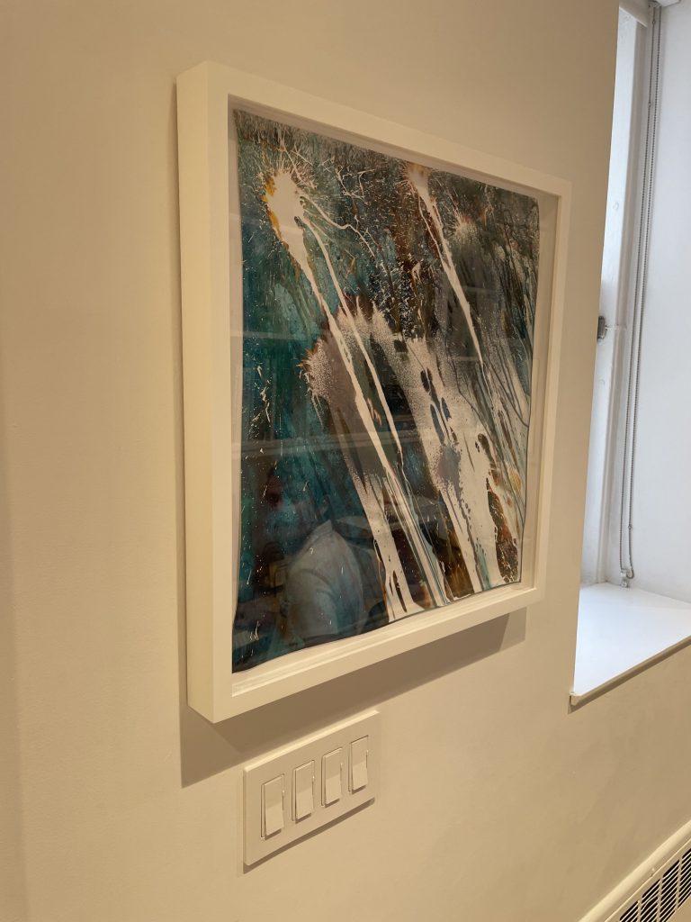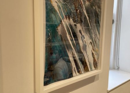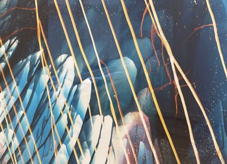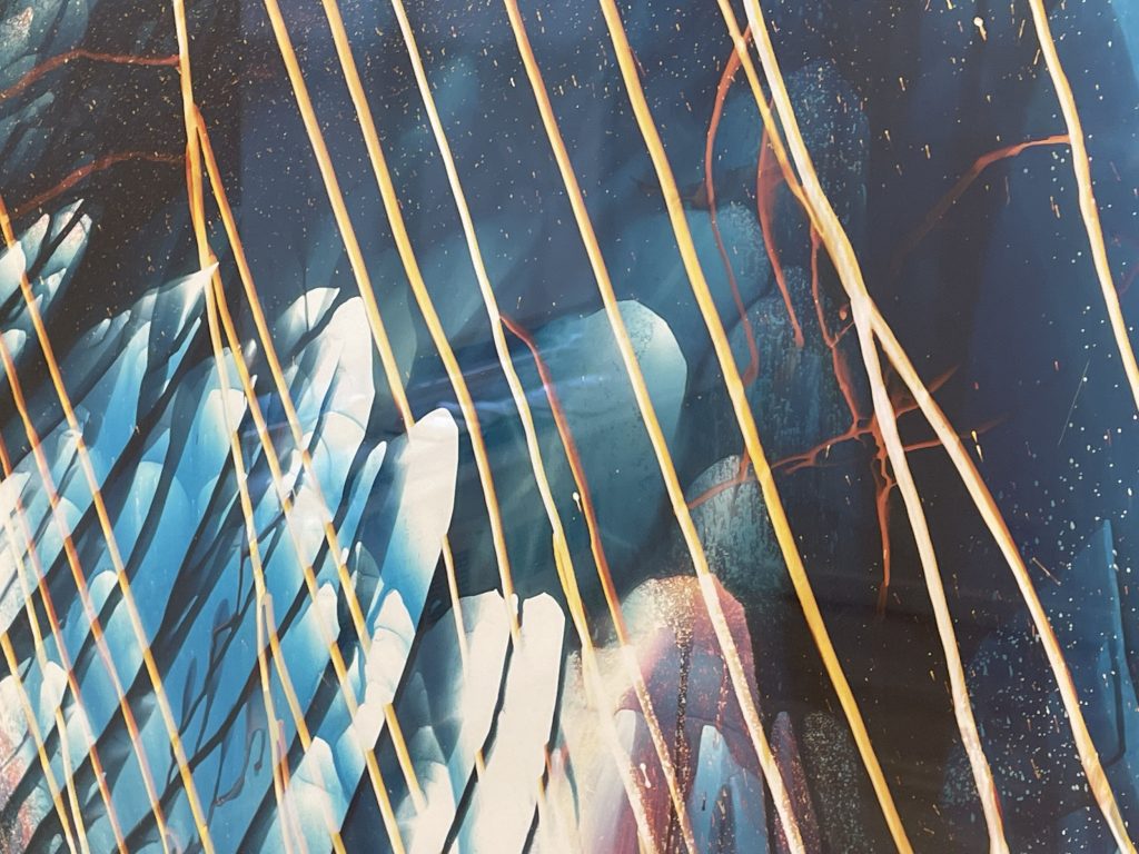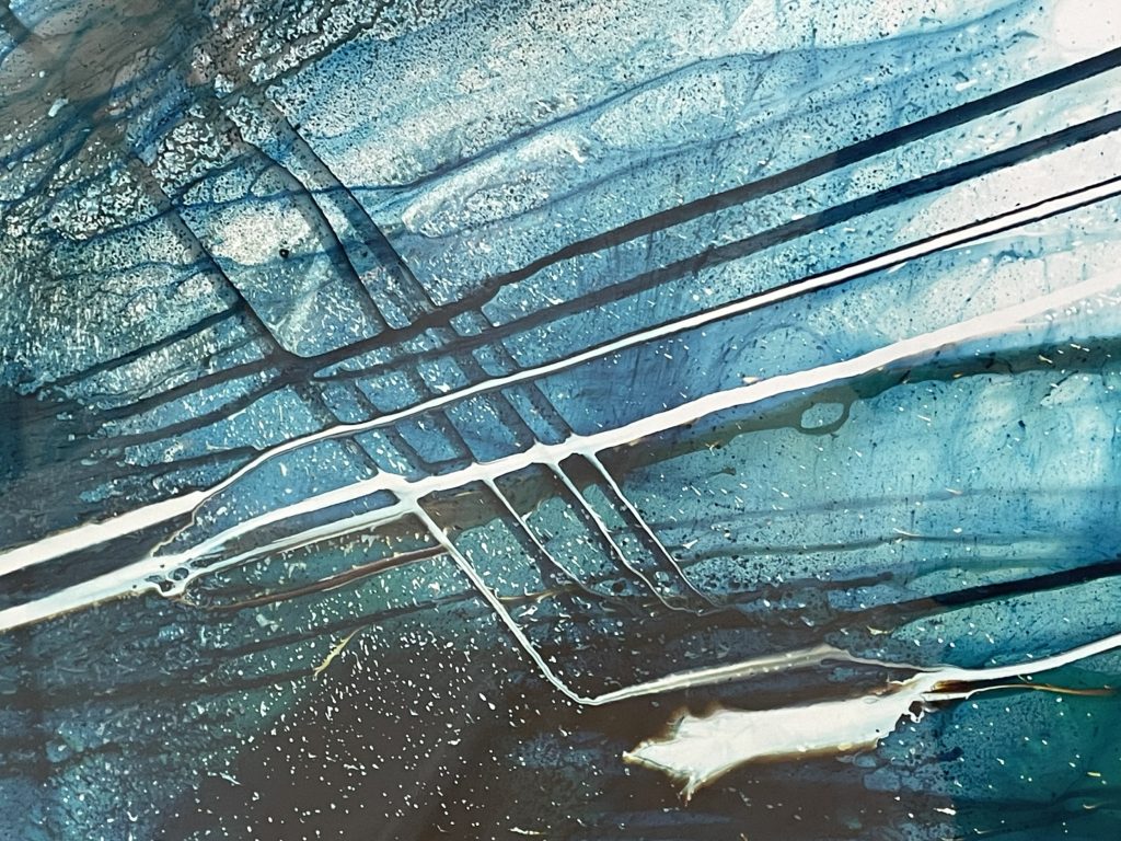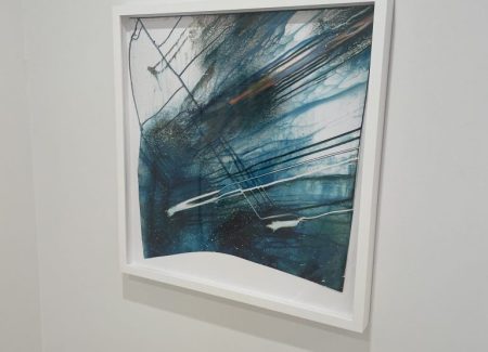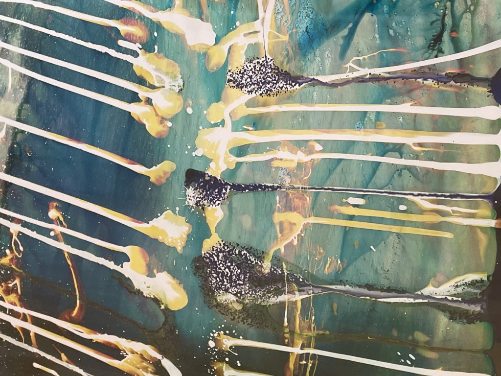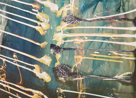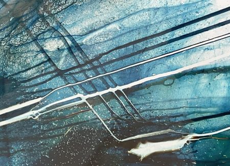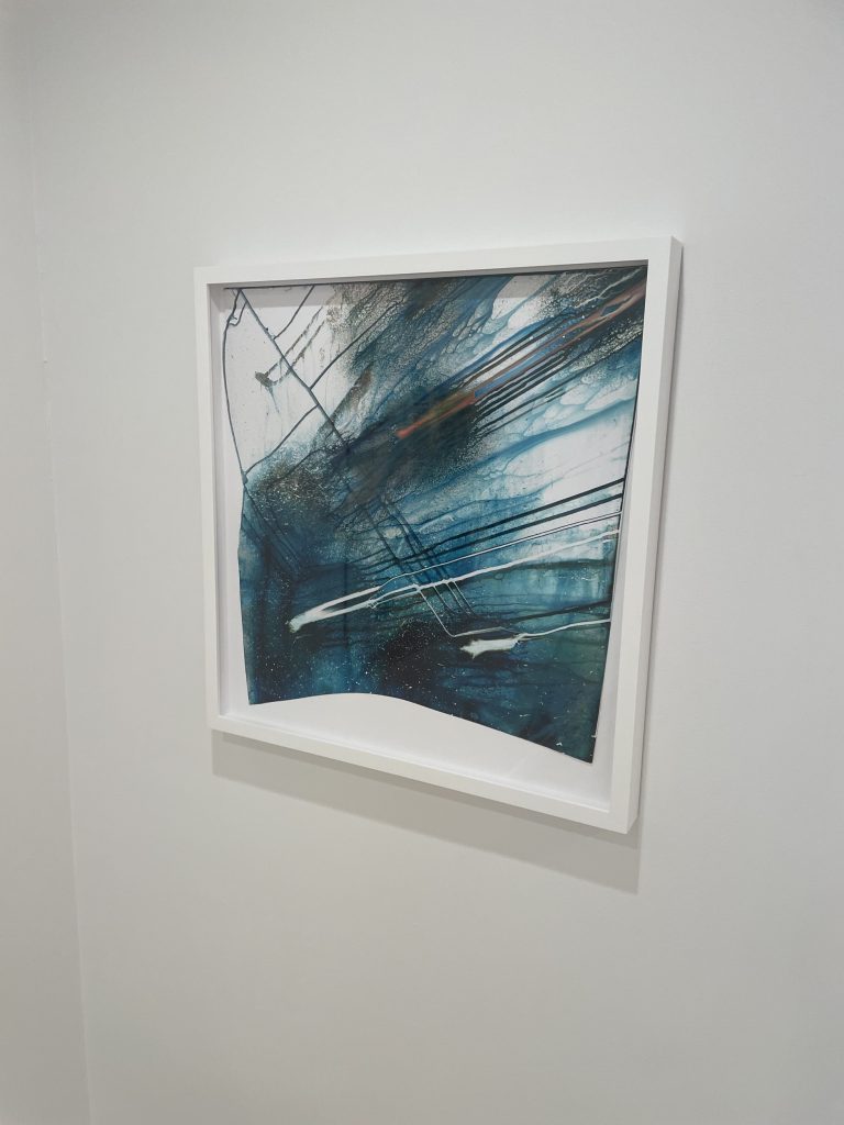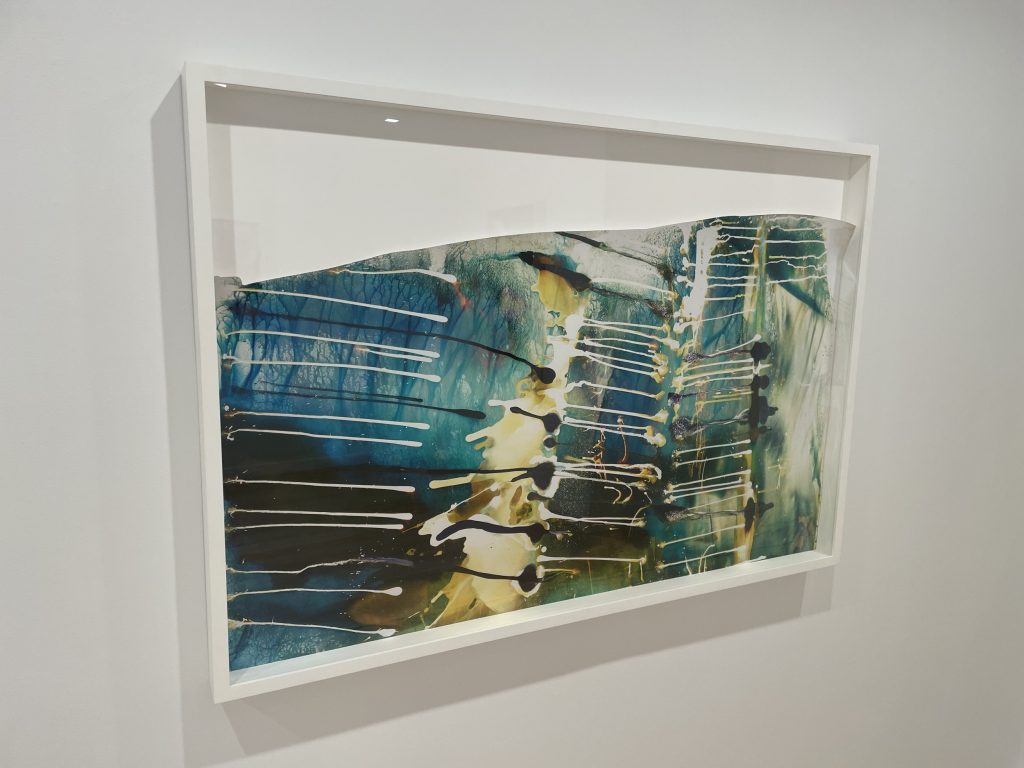 This aesthetic backstory is relevant because the current 2022 show largely reaches back to rediscovered works originally made in 2014 and 2015, in that more wet and washed style, and uses them as raw material. Several of the finished works on view come unaltered from those years, with compositions enlivened by streams of fluid that seem to drift and fall across the surface. In four works rooted in hues of blue and green, these lines (in white, black, and other colors) finger and interlace, dripping across each other like thin lava flows, or falling away from central spines like insistently layered or offset stripes; when these flows are pointed (or rotated) “upward”, they seem to have even more explosive energy, like rivulets of colored rain blasting across a windshield.