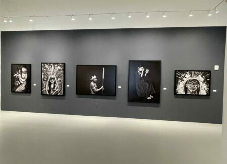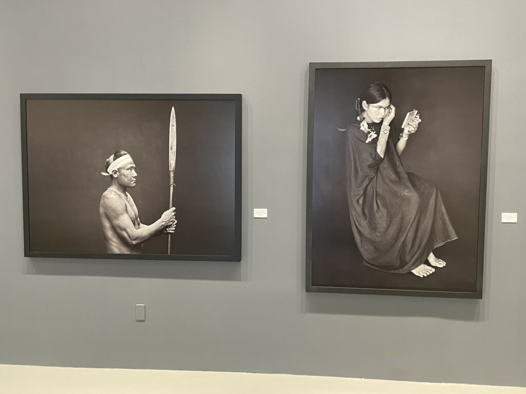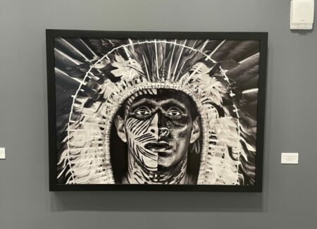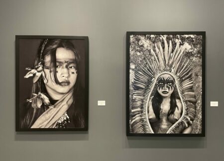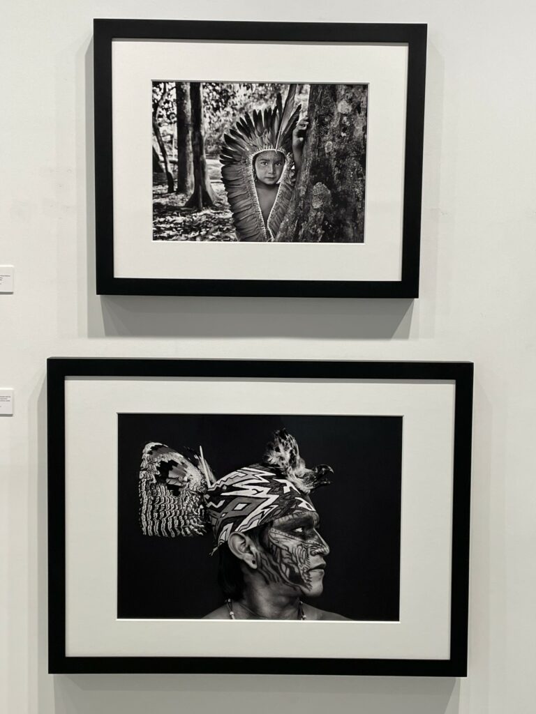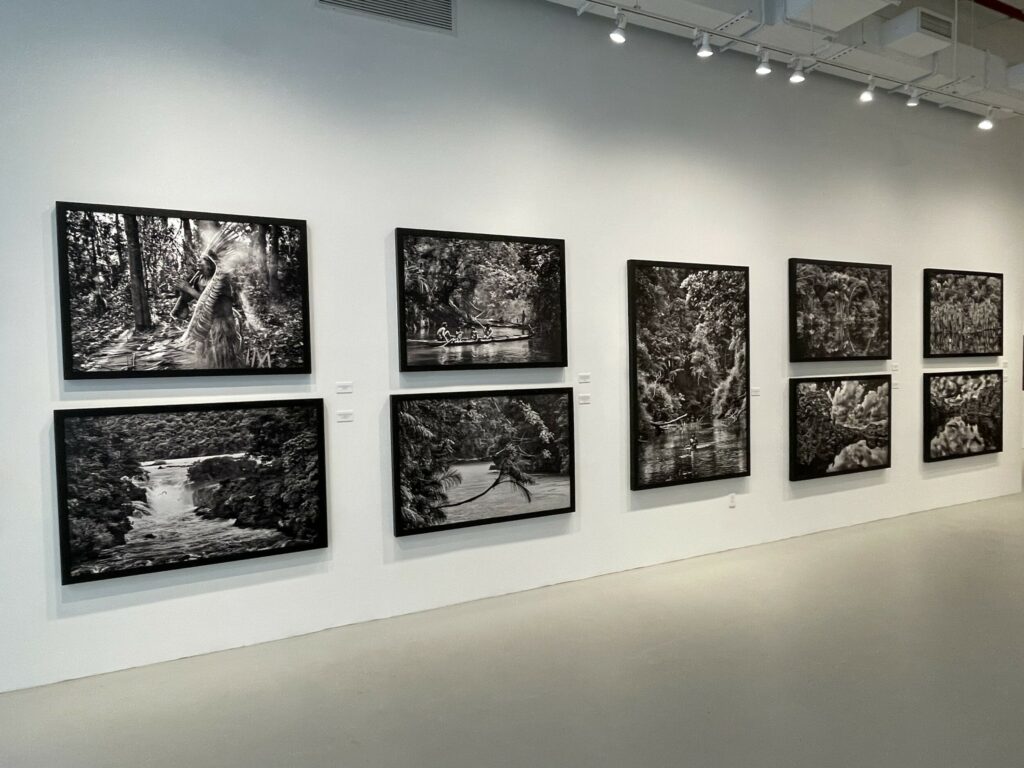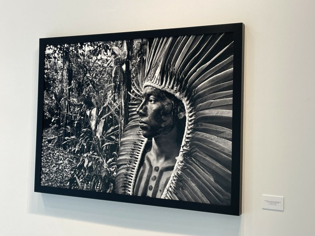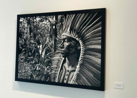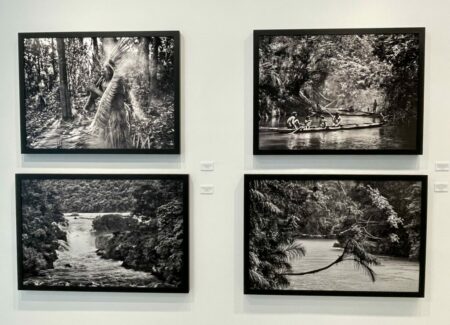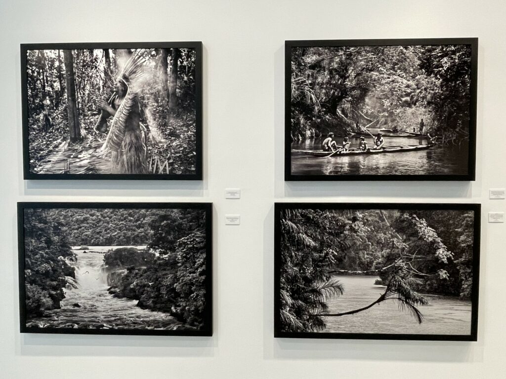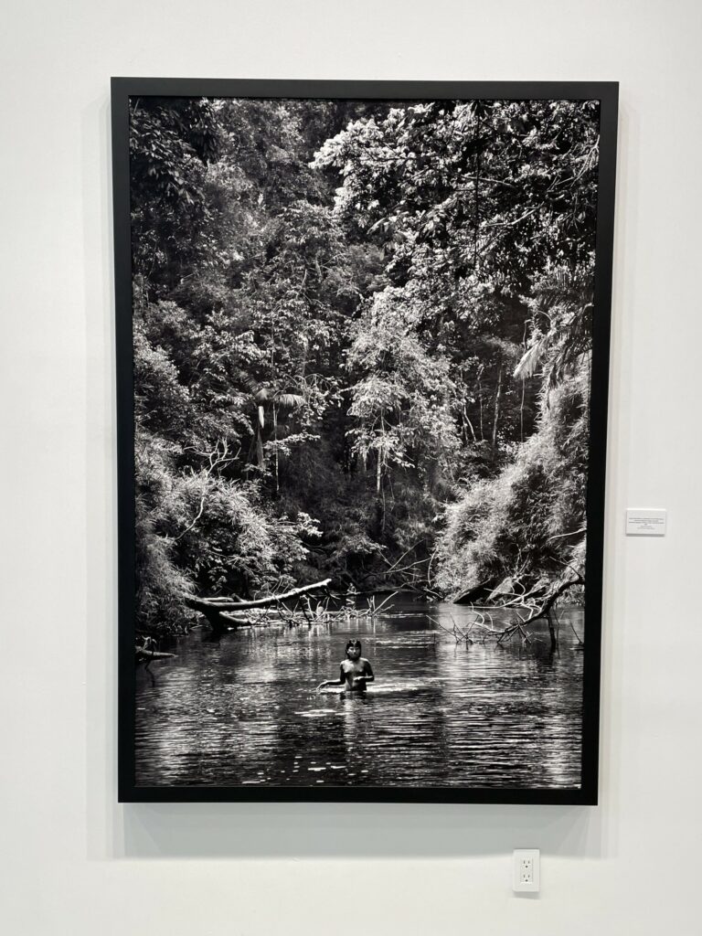 At the other end of the scale and grandeur spectrum are much more intimate portraits of indigenous peoples and their various daily rituals, as seen from close up. Salgado spent time with the Yanomami, the Yawanawá, and the Zo’é, among others, building up enough trust to be allowed to be present at everyday events like fishing, bathing, and simply resting, in addition to special occasions and rites of passage when decorative clothing and body paint were in use. A massive print of a marching line of warriors dominates one wall (over the reception desk), but many more of the images of daily life are less imposing. A pair of silhouetted figures paddle along at daybreak, a young woman bathes in an edenic stream, and families fish in canoes underneath the backdrop and overhang of the enveloping forest. Salgado also brought along a makeshift studio setup, where he made isolated portraits against black linen. His portraits, several of which are installed along a dark grey wall, are unexpectedly beautiful, almost disconcertingly so, with penetrating stares doused in dark makeup and elaborate feathered headdresses surrounding intricately painted faces. Of course, some of these pictures edge towards a “noble savage” trope, but again, the strongest pictures of people resist the urge to make the images unusually dramatic, leaving some mystery and magic in the gestures and shadows.