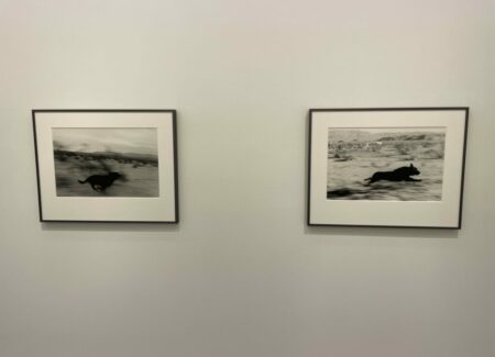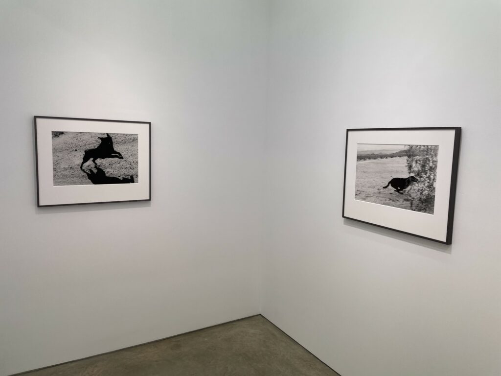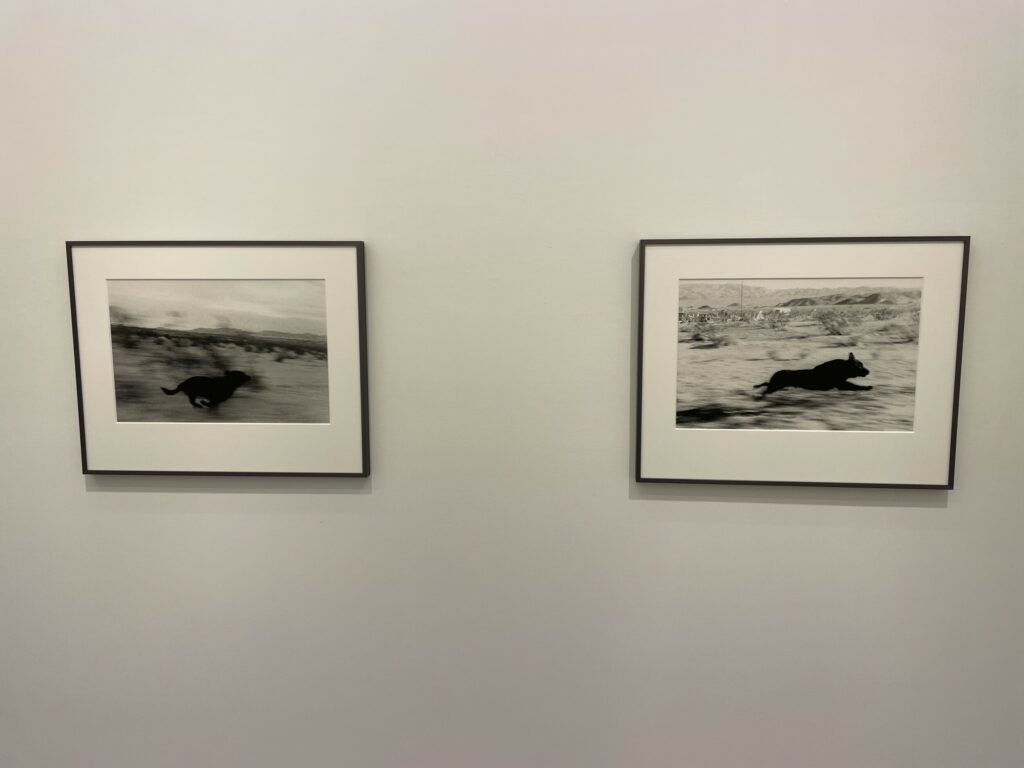 There is something durably magnetic about these seemingly simple pictures. As I was standing in the small gallery space, two young men who had never seen the photographs before came in and were mesmerized by what they saw, the elemental forms of the blurred dogs in motion at once vaguely comic, a bit futile (they never catch the car of course), and powerfully animal and real. Photographically, the contrasts of light and dark give the pictures undeniably boldness, and the conceptual underlayers of the man/dog chase and its meanings add richness to how we might interpret the scenes.