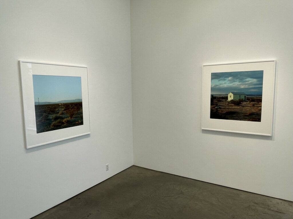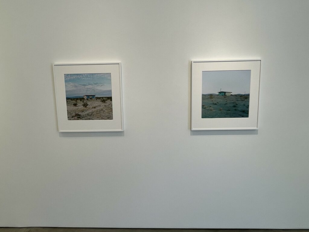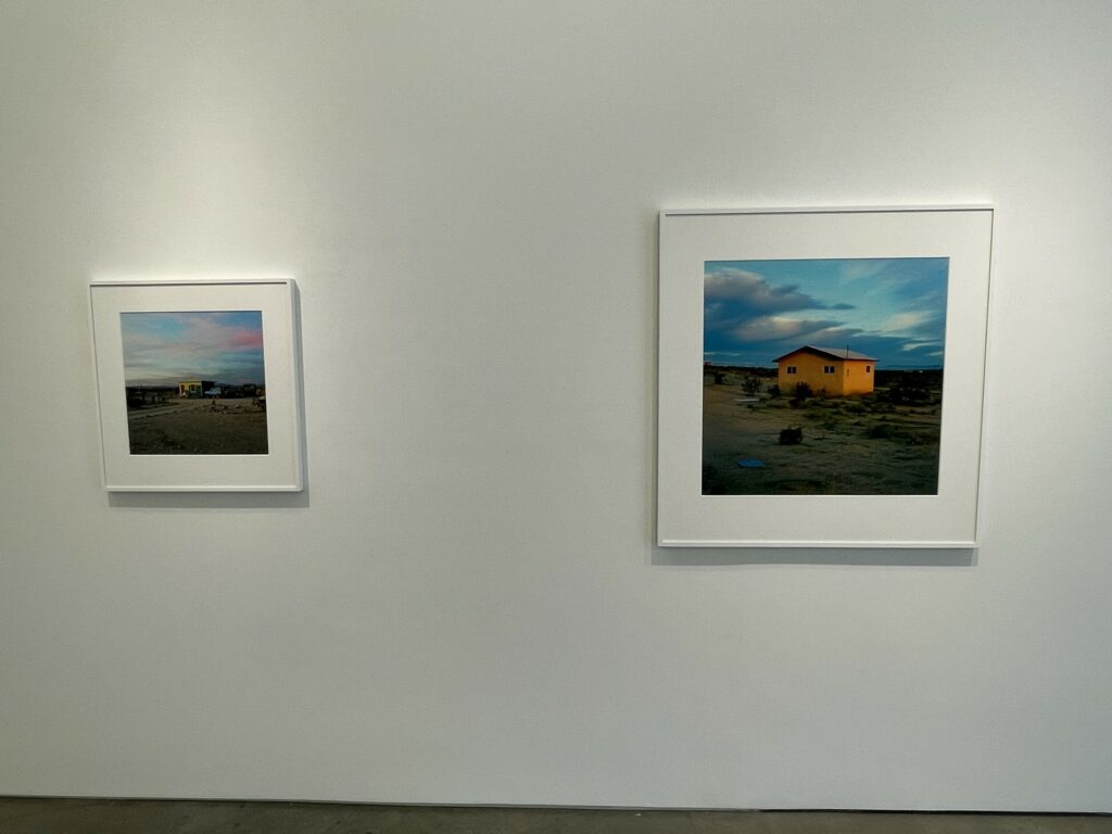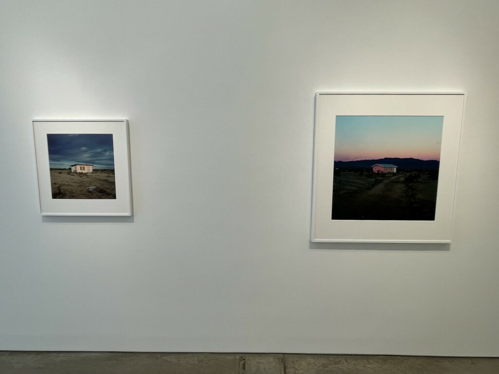 Even within Divola’s compositional constraints, each house is seen as an individual, including the one dwarfed by the astonishing orange and red maelstrom of a glorious desert sunset. And while many of the houses were likely uninhabited or abandoned, Divola’s pictures seem to celebrate a sense of frontier individualism and plucky defiance of the severe environmental conditions in the surroundings. This determined (or delusional) optimism stands in contrast to the more austere and decayed black-and-white atmosphere captured by Mark Ruwedel’s photographs of similar desert houses in the mid 2000s.