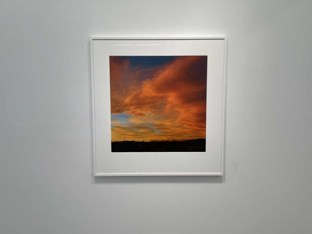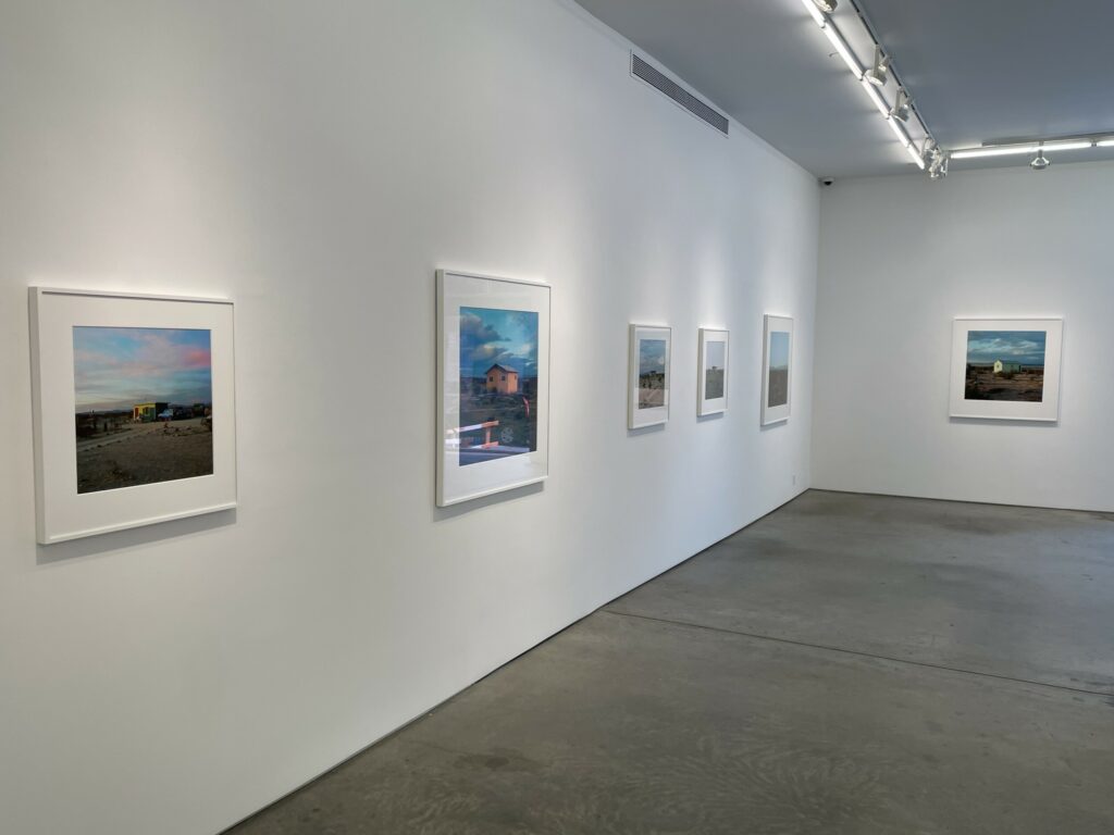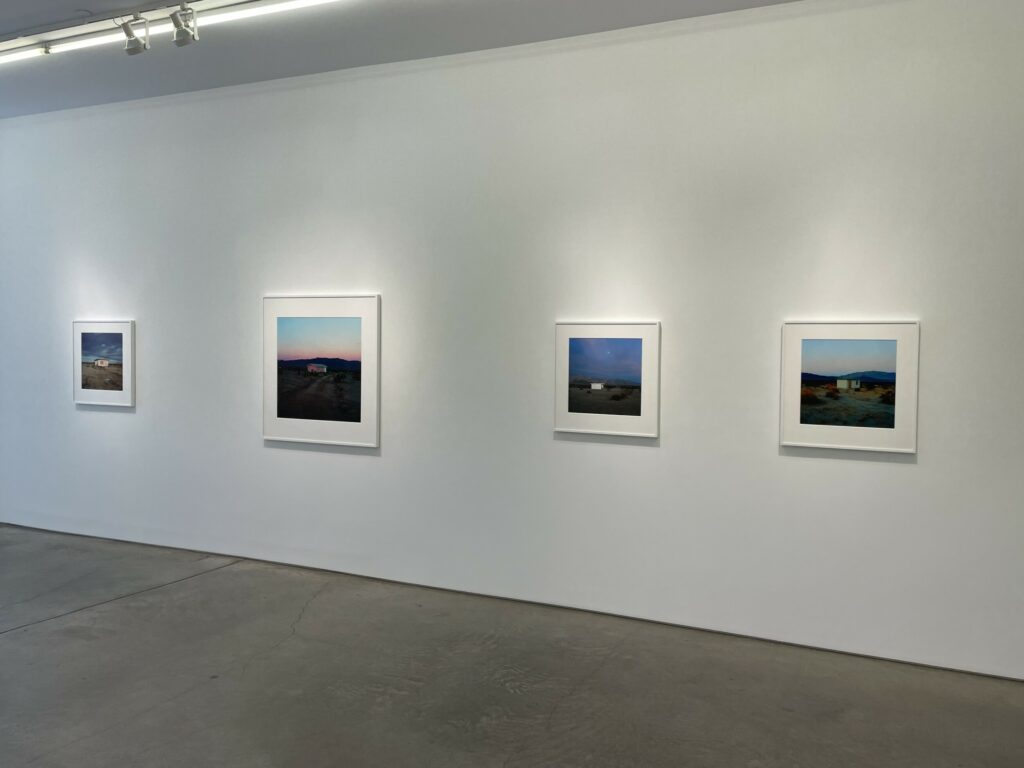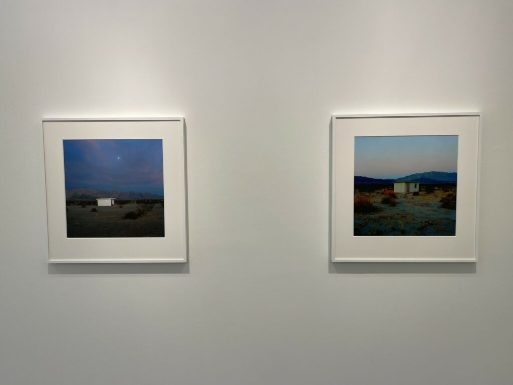 Even within Divola’s compositional constraints, each house is seen as an individual, including the one dwarfed by the astonishing orange and red maelstrom of a glorious desert sunset. And while many of the houses were likely uninhabited or abandoned, Divola’s pictures seem to celebrate a sense of frontier individualism and plucky defiance of the severe environmental conditions in the surroundings. This determined (or delusional) optimism stands in contrast to the more austere and decayed black-and-white atmosphere captured by Mark Ruwedel’s photographs of similar desert houses in the mid 2000s.