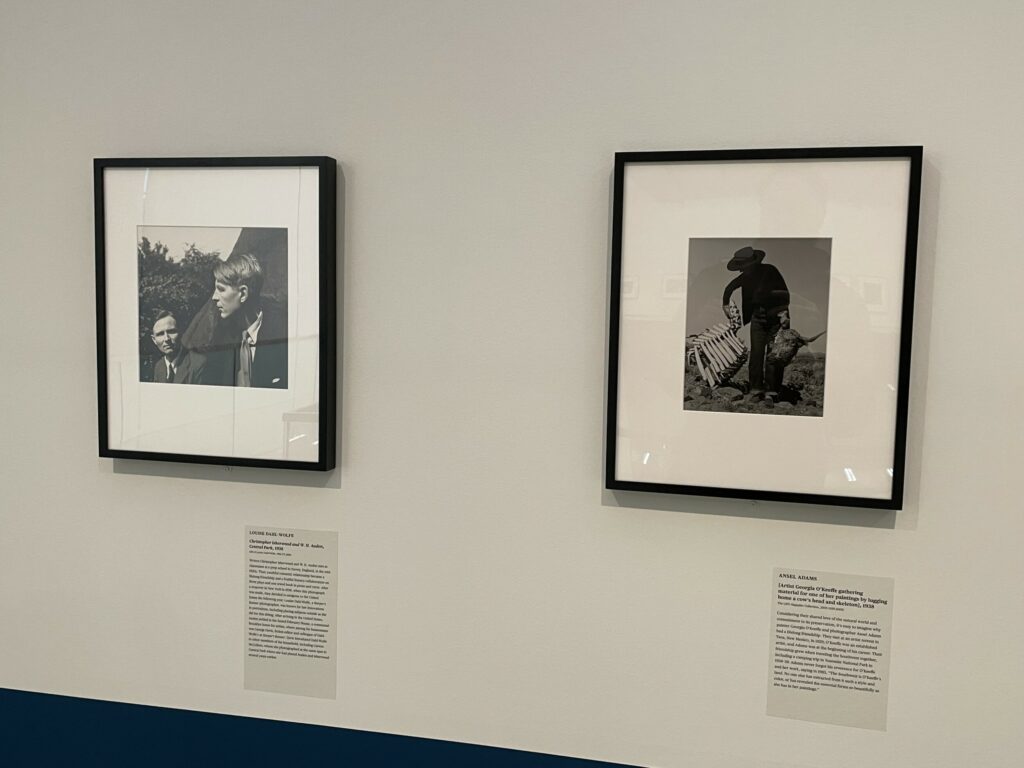 When photographers make portraits of artists that work in other mediums, the connection is slightly different than when they point their cameras at other photographers. Edward Steichen’s portrait of Constantin Brancusi in his studio is relatively formal, with the bearded sculptor posed among his clustered sculptures like one of the artworks; an image of Robert Delaunay by Florence Henri has a similarly serious artfulness, with the artist seen in profile near one of his paintings with its own sinuous vertical curves. More casual are Ansel Adams’ image of Georgia O’Keeffe lugging a cow’s head and skeleton through the desert, and Henri Cartier-Bresson’s picture of Alberto Giacometti crossing the street in the Parisian rain, with his raincoat pulled over his head. The fun gets even more lively in Alexander Liberman’s images of the painter Helen Frankenthaler, one of her dancing with Barnett Newman and another of her comfortably hugging David Smith.