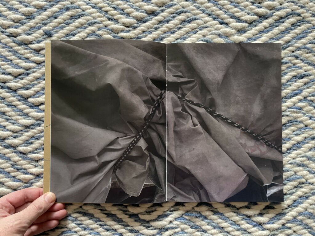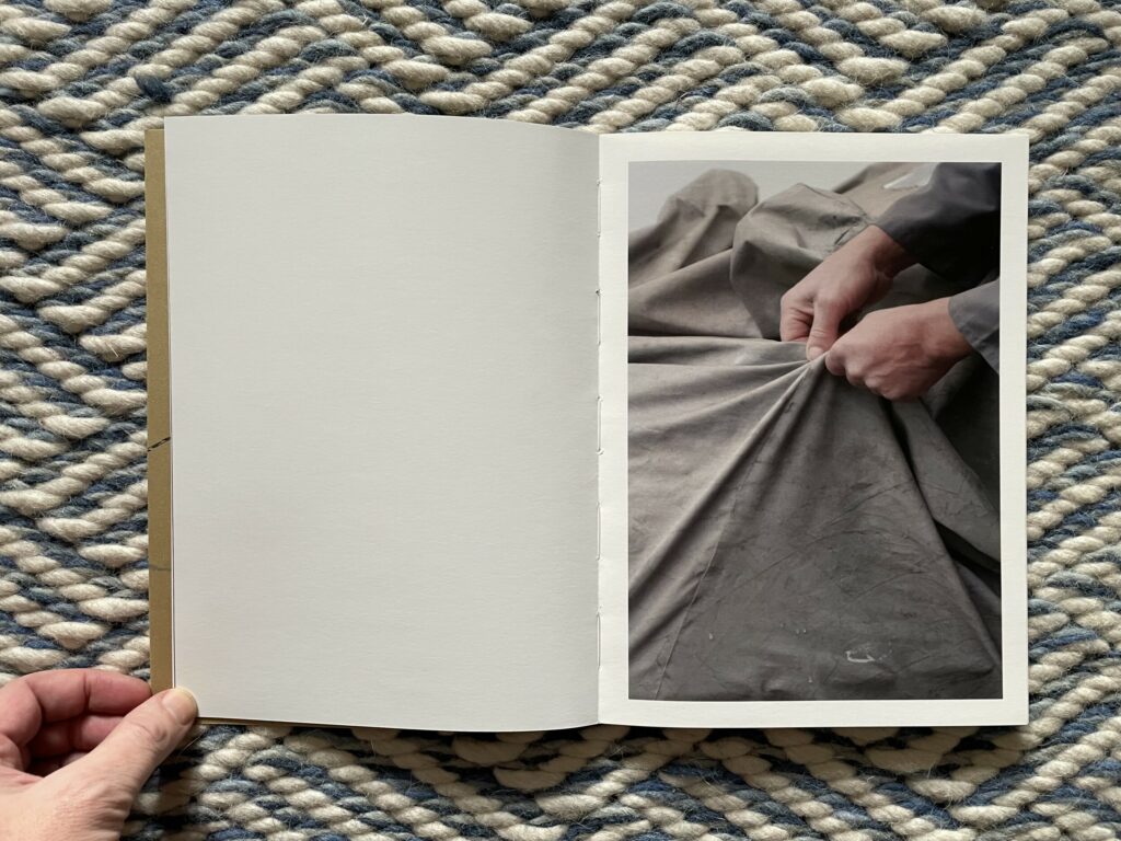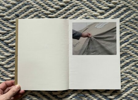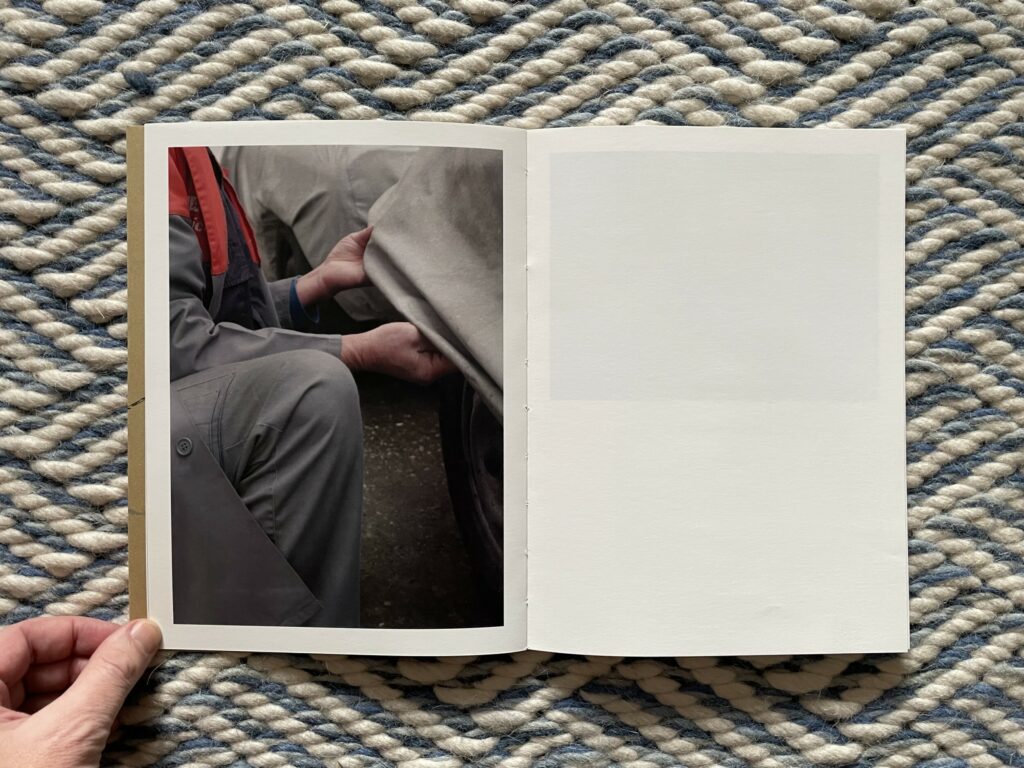 How to drive begins with a very slow reveal, almost like a ceremony, extended over ten photographs. The car to be driven is covered with a sewn fabric cover that has been patched with duct tape and tied down with bungee cords. Anonymous male hands dressed in some kind of work coat slowly pull back the cover with a gentle touch, and Moschou’s tightly cropped photographs revel in the changing folds, gathers, and wrinkles of the drapery. Eventually part of a wheel is exposed, and then a glimpse of a bumper and white side panel is offered, but we never actually see a full view of the car – its particular identity remains elusively unstated, perhaps only identifiable by true car connoisseurs. What we see instead are fleeting fragments, with Moschou actively playing with the possibilities of the surfaces and textures.
