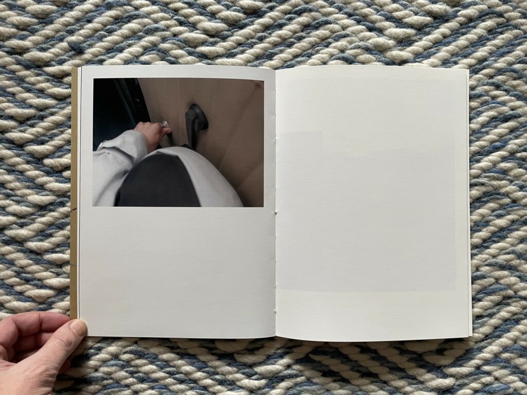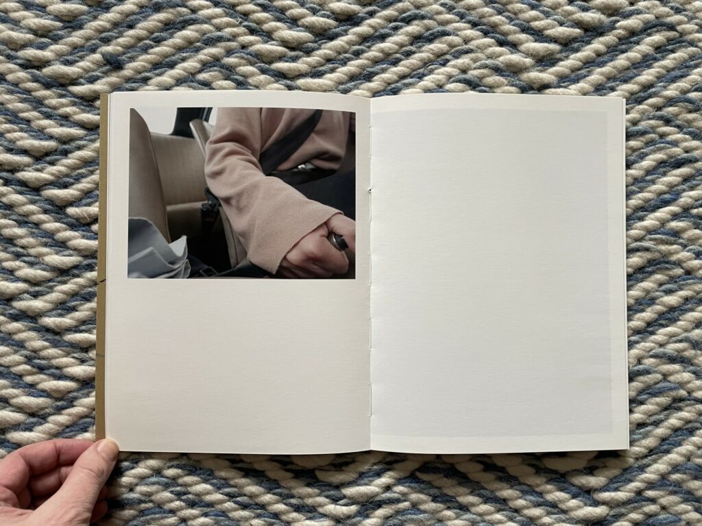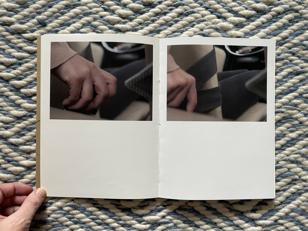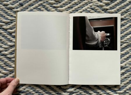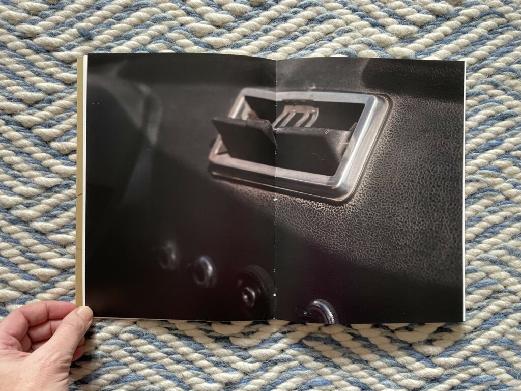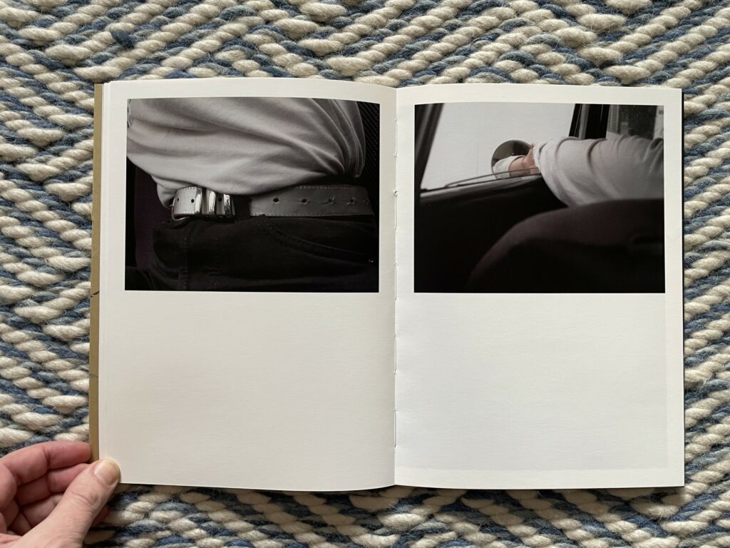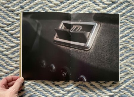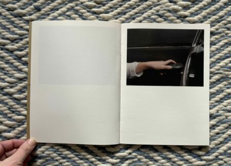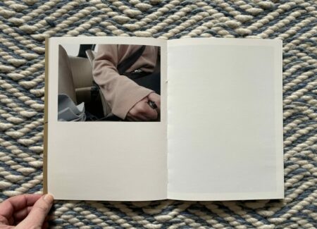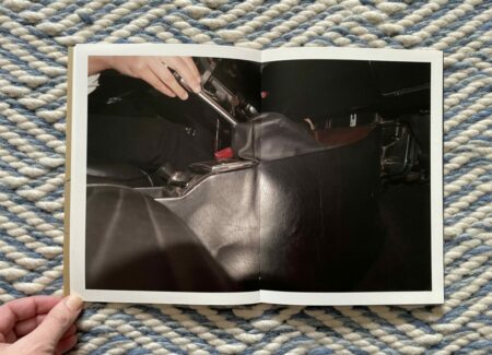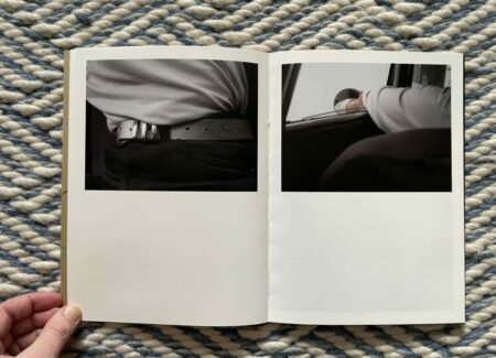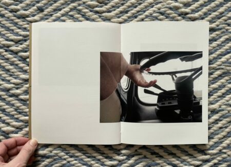 Of course, for anyone who knows how to drive, these images will at first glance seem altogether forgettable and banal. But they are more cinematic than the pictures from a standard owner’s manual, and the framing of the details is tight to the point of near abstraction. It’s as if Moschou has forced herself to closely observe the humble interior of a car like it was something foreign to her, noting each detail and its possibilities for being seen with style or grace. While there seem to be moments of anxiousness and frustration in these pictures, they are balanced by the gentle caress of a hand on an arm rest, the casual hanging of loose fingers off the steering wheel, or the twist of a shirt held fast by a belt with a silver buckle. The book ends with absence, a spot of sunlight cast across the ripples of leather on an empty seat.