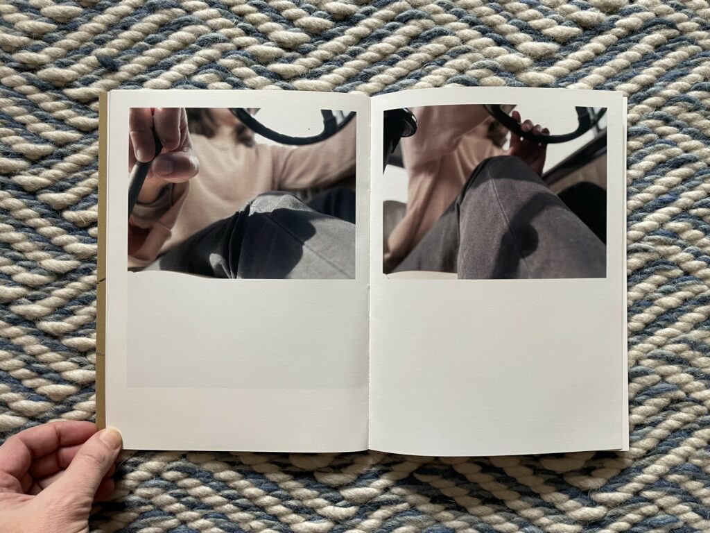 With the installation of automatic transmissions in most contemporary cars, the operation of a old school stick shift has become something of a lost art in many parts of the world, but this particular Italian car requires a driver who can operate a stick. Moschou’s photographs introduce the gear shift, the clutch, and the other accelerator and brake pedals on the floor, in some cases taking a worm’s eye view of the car’s floor. After a visual tutorial on releasing the parking brake, she then shows us the layered this-then-that choreography of gripping the stick and pressing the pedals, with various shots of hands and feet pushing and pulling, some seen from the passenger side, others from nearly underneath looking up through the steering wheel to the white sky behind the windshield. Our teacher starts wearing a light brown sweater and dark jeans, but after some physical twisting and turning, the sweater disappears and the sleeves of her white shirt are rolled up, almost in a gesture of “getting to work”.