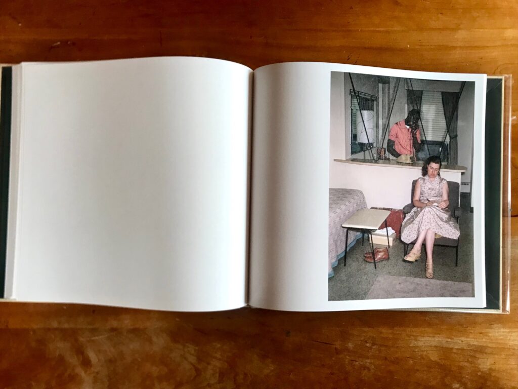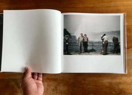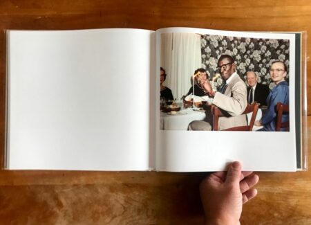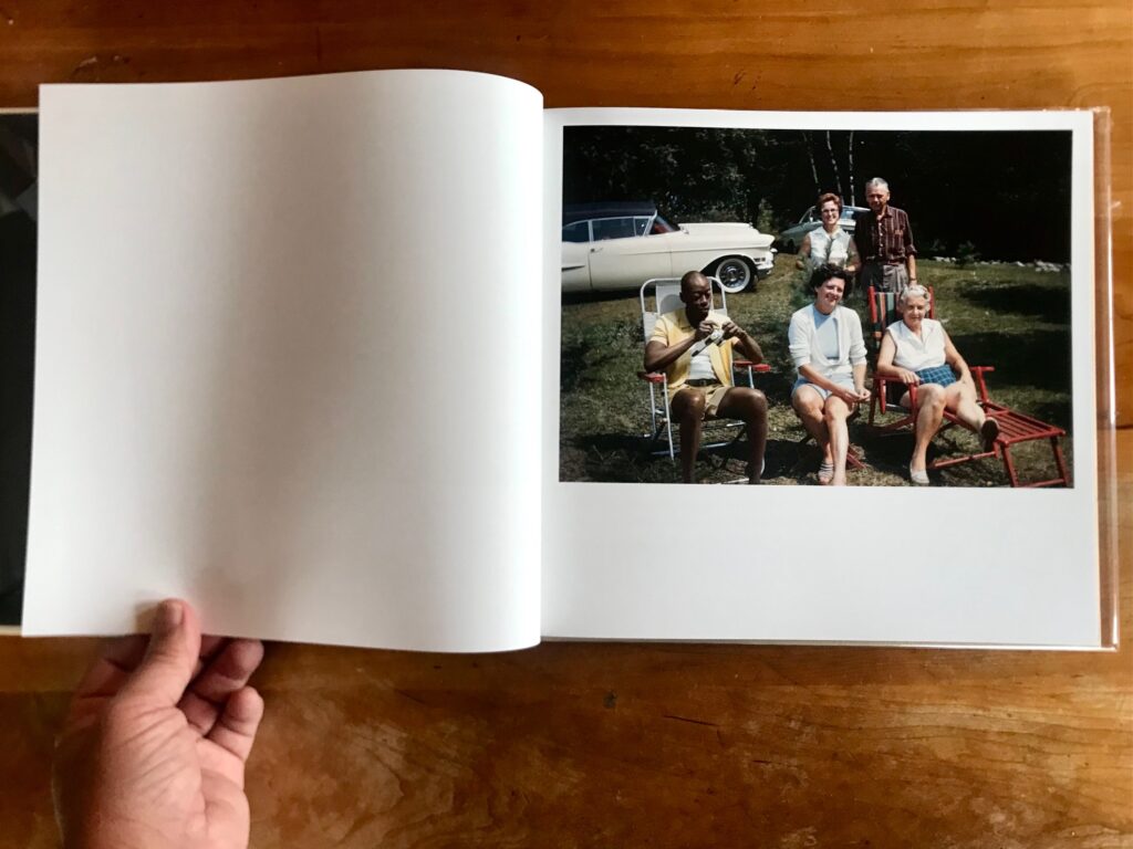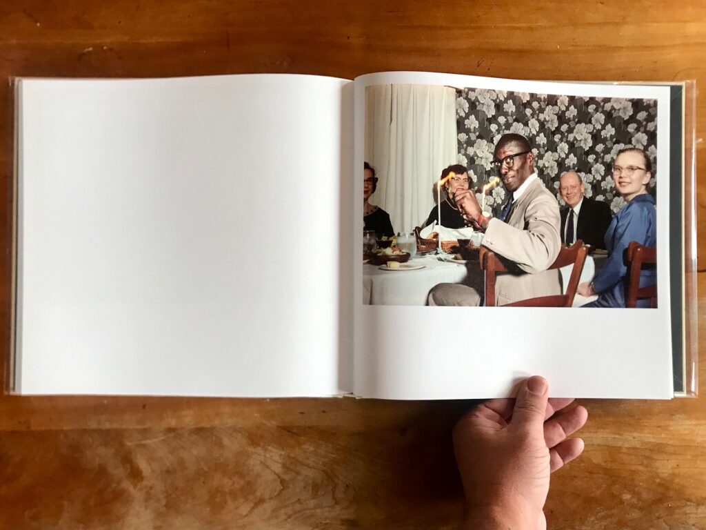 The Anonymous Project’s latest project Being There is a collaboration with Diop. As with much of Diop’s oeuvre, he casts himself here in a beguiling variety of costumes, poses, and characters. Each role fits like a glove into a particular background photo supplied by Shulman, chosen from North American snapshots made in the 1950s and 1960s. Like the old Reese’s ads, worlds collide in each picture. A young African man plucked out of context and plopped into post-war lily-white vacations: cultural historians can see where this is going already, and the photo combinations are as just jarring and hilarious as one might expect. Many are laugh-out-loud funny. But this photobook operates at a serious level too. In fact it’s one of the sharpest social commentaries I’ve encountered in any recent monograph.