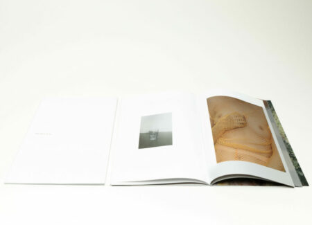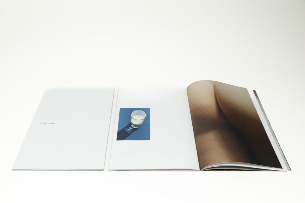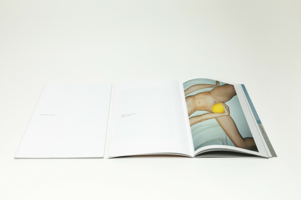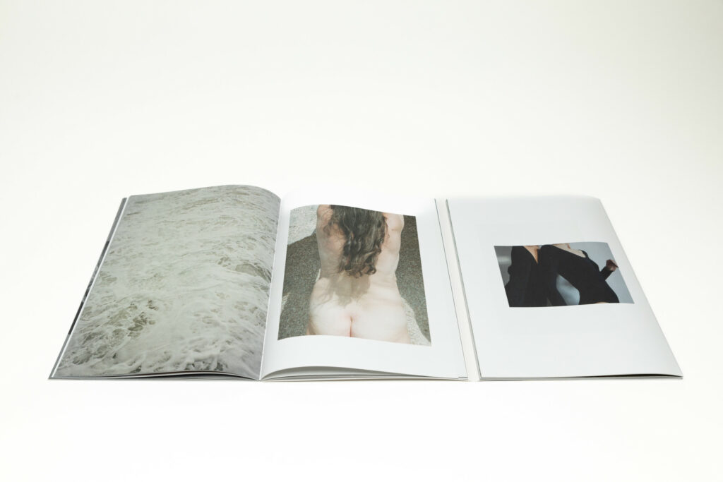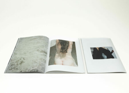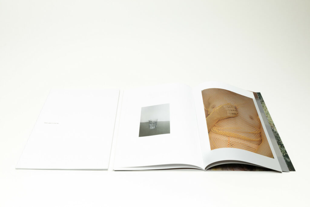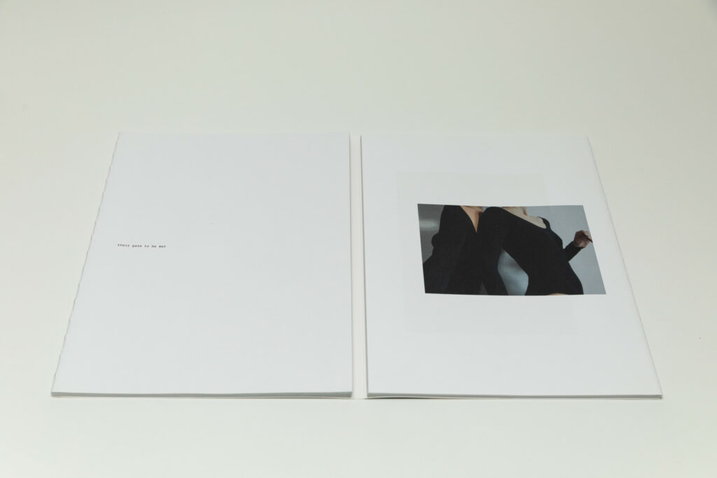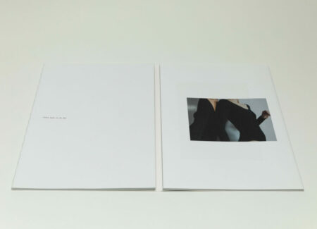 The photographs were created in the artists’ respective locations, and then sequenced together through a virtual conversation between the sisters. As a result, the creative principles of dialogue and duality, rather than any singular subject matter, thread the book together. Together Apart explores moments of both connection and disconnection, blending portraits, tender body shots, still lifes, and landscapes. The first spread, with two books closed, shows a photograph of two young women in black bodysuits, their heads cropped out, leaning against each other, and the line on the left side reads “their gaze to be met”. From here, the viewer is invited to interact with the book, browsing one book at a time, or exploring them simultaneously, with the idea of igniting a sense of curiosity and playfulness.