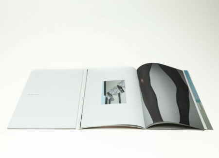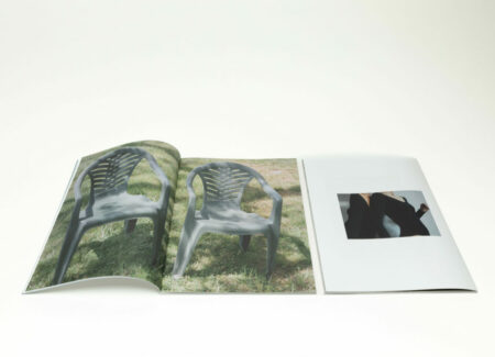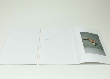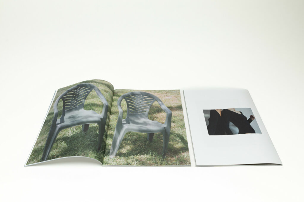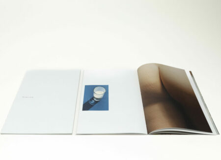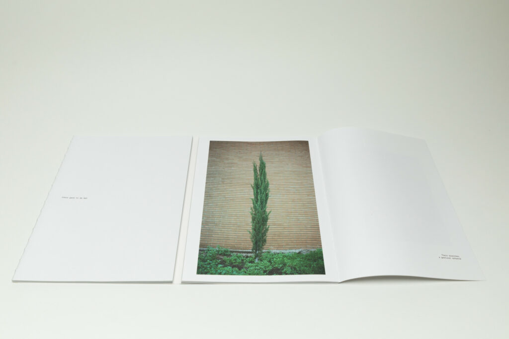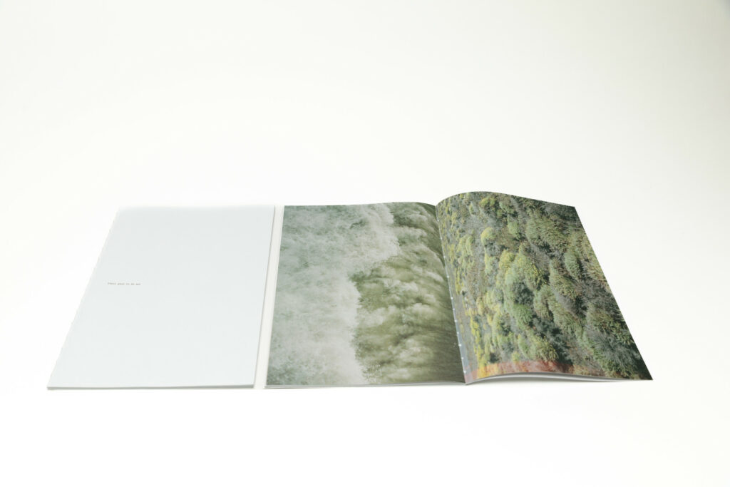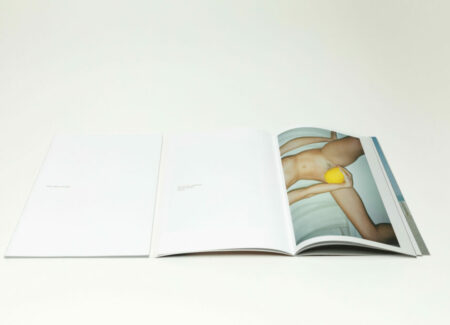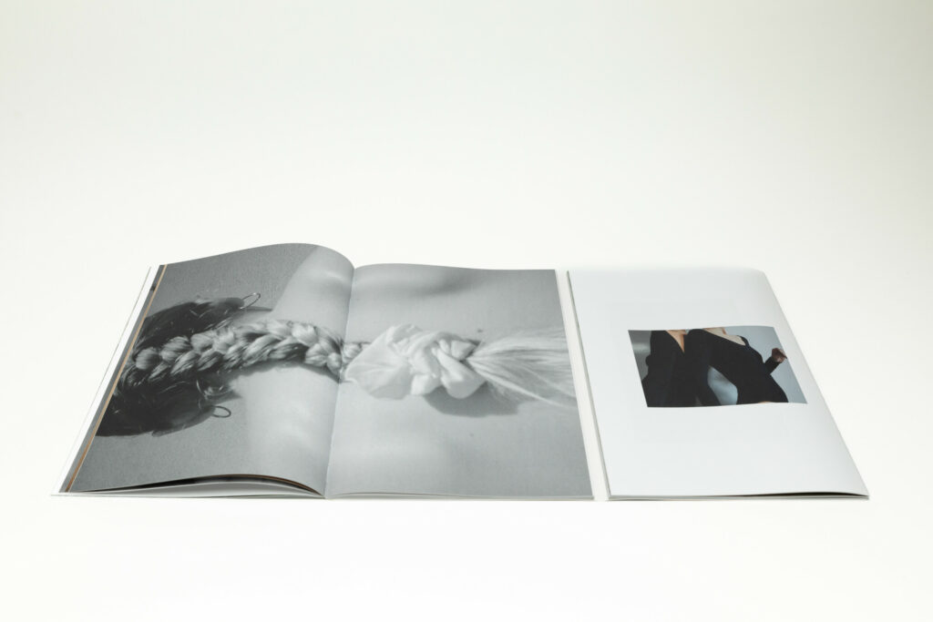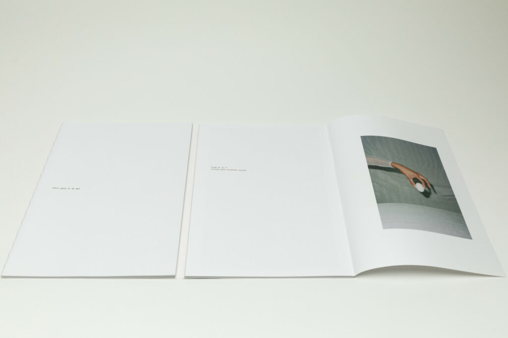The photographs were created in the artists’ respective locations, and then sequenced together through a virtual conversation between the sisters. As a result, the creative principles of dialogue and duality, rather than any singular subject matter, thread the book together. Together Apart explores moments of both connection and disconnection, blending portraits, tender body shots, still lifes, and landscapes. The first spread, with two books closed, shows a photograph of two young women in black bodysuits, their heads cropped out, leaning against each other, and the line on the left side reads “their gaze to be met”. From here, the viewer is invited to interact with the book, browsing one book at a time, or exploring them simultaneously, with the idea of igniting a sense of curiosity and playfulness.