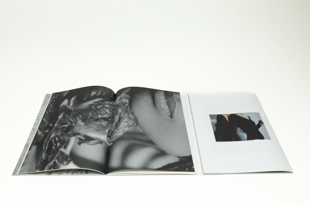 Skin, another timeless symbol of connection, emerges as a recurring motif, representing the intersection between our inner selves and the outside world. In one close up shot, the arms of a couple are intertwined in a tender embrace. In another spread, a small image showing an opening in red fabric revealing bare legs and pubic hair is paired with a full page photograph of a young man in a white dress with an open back.